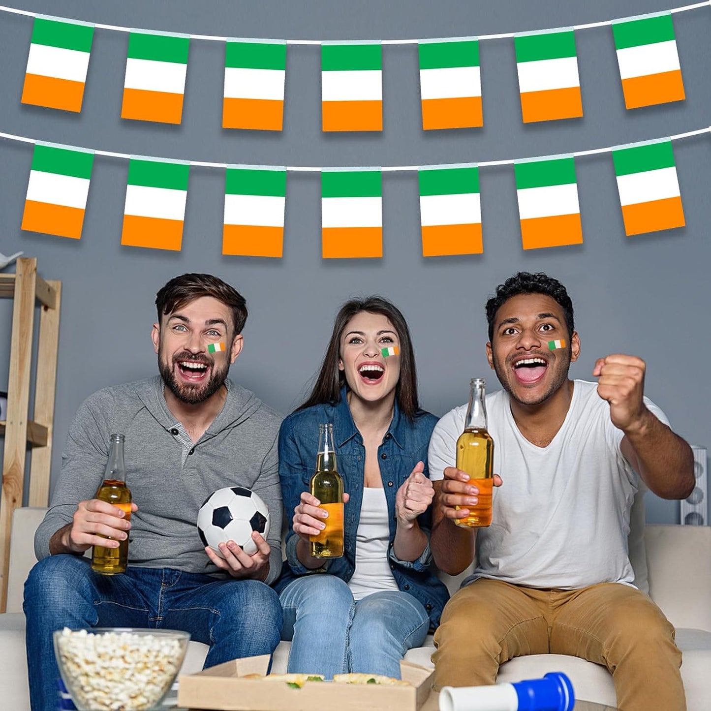 Ireland Rectangle Bunting 10m with 20 Flags. This bunting measures 10m and has 20 pennants. Material: PVC. Approx size of each Flag/ Pennant 30x20cm. Introducing the vibrant and versatile Bunting 10m with 20 Pennants, a delightful addition to any celebration or decorative endeavor. This charming bunting boasts a length of 10 meters, providing ample coverage to adorn various spaces with whimsical flair. Crafted with high-quality, durable materials, each of the 20 pennants is designed to withstand outdoor elements, making it suitable for both indoor and outdoor use. Whether you're hosting a festive gathering, sprucing up a garden party, or adding a pop of color to a room, this bunting is sure to captivate attention and evoke a sense of joy and celebration. With its eye-catching design and array of vibrant colors, it effortlessly infuses any setting with a playful and festive atmosphere. Ideal for birthdays, weddings, graduations, or simply adding a touch of charm to everyday life, the Bunting 10m with 20 Pennants offers endless possibilities for creative expression. Hang it along fences, walls, ceilings, or across outdoor spaces to instantly transform any environment into a visually stunning spectacle.