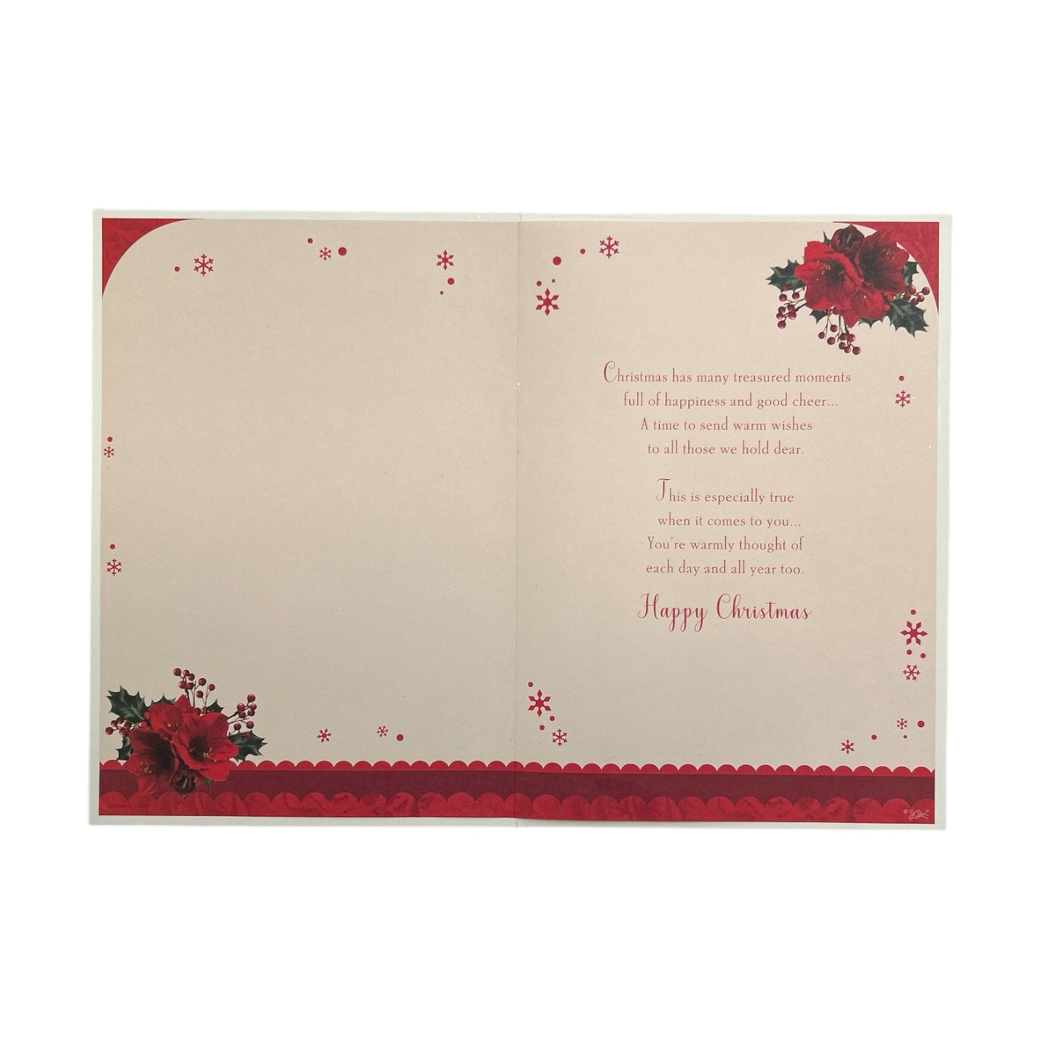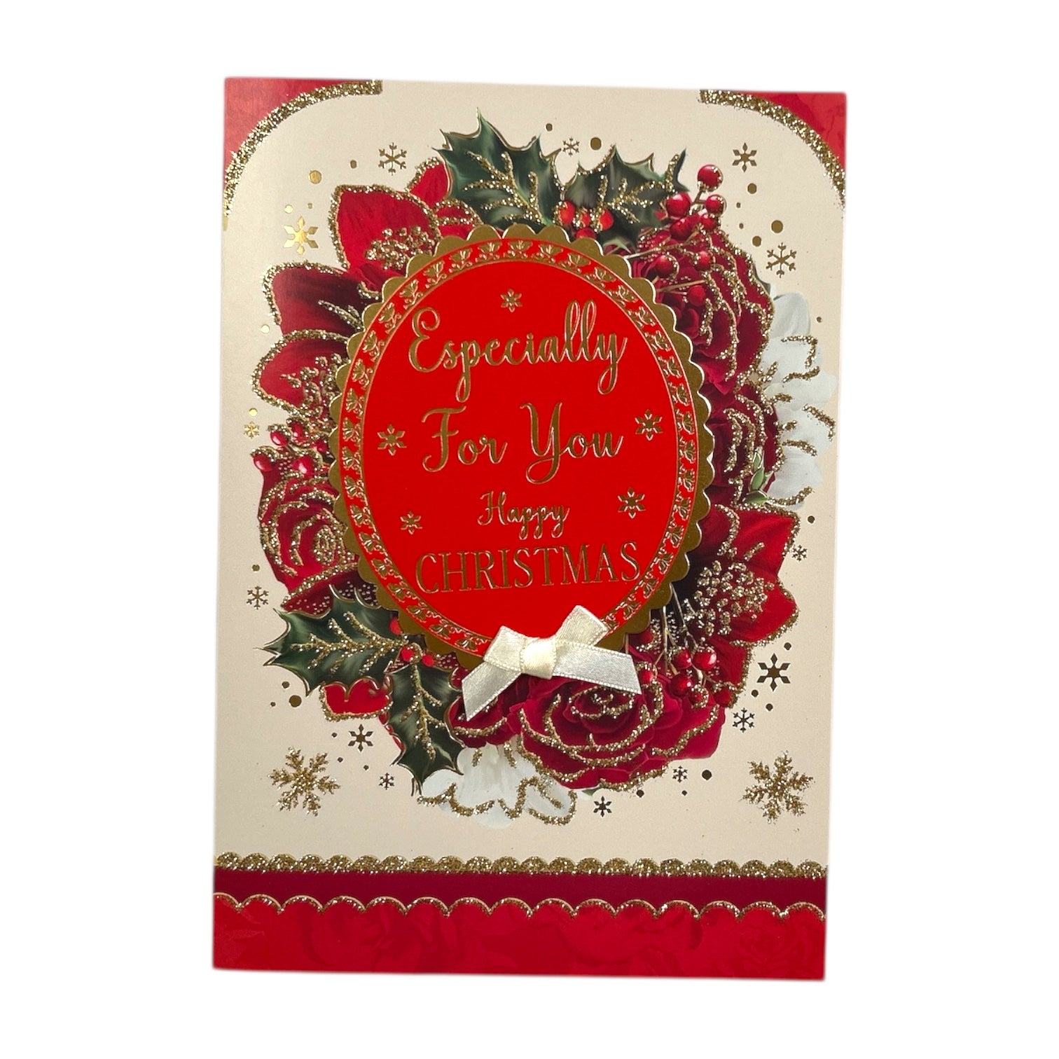 Send warm festive wishes with this elegant Christmas card, beautifully designed with a decorative wreath of red roses, holly, and berries. Accented with shimmering gold glitter, the rich red and green details stand out against the soft cream background, creating a timeless and festive look. The message ‘Especially For You’ and ‘Happy Christmas’ in gold lettering adds a heartfelt touch, making this card perfect for sharing love and joy with someone special. Traditional yet stylish, it’s a wonderful keepsake to brighten the holiday season. Approx. size 225 x 155mm, the card comes with a coordinating envelope.