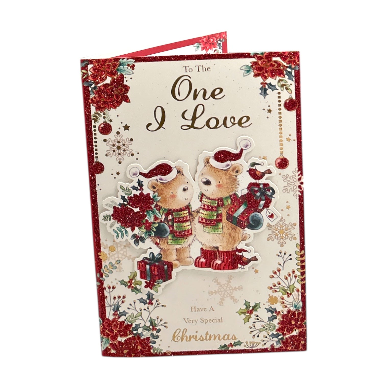 Celebrate the magic of the season with this heartwarming Christmas card for someone truly special. Featuring two adorable bears dressed in festive winter attire, exchanging gifts amid snowflakes, holly, and poinsettias, the design radiates love and joy. A sled filled with presents and hanging ornaments adds playful charm, while the glittery red floral border enhances the card’s festive elegance. The message “Have a Very Special Christmas” expresses affection and togetherness, making this card a perfect keepsake for your loved one. Crafted with care and seasonal sparkle, it’s a beautiful way to share your heart during the holidays. Whether romantic or sweet, this card captures the warmth of love at Christmas. Approx. size: 225 x 155 mm.
