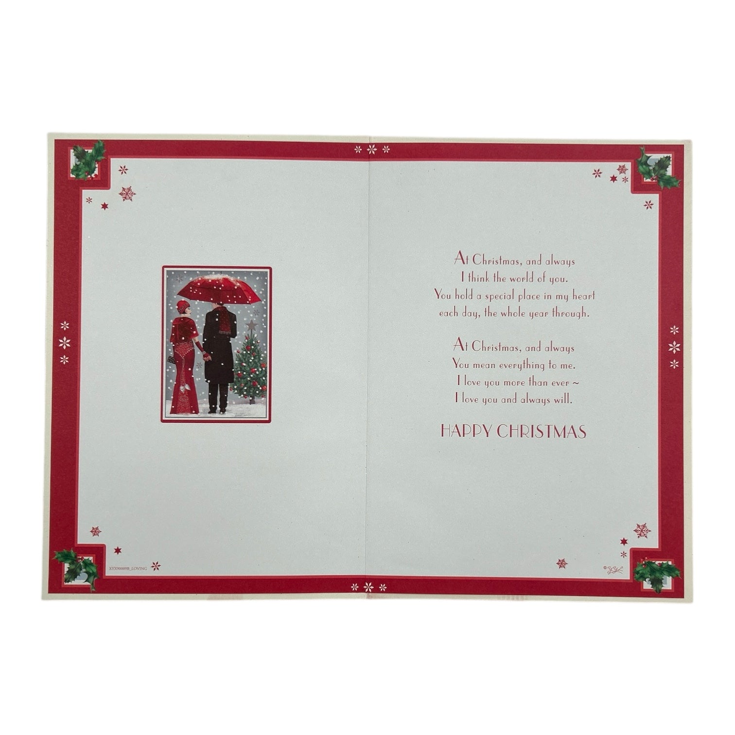 To The One I Love – Lovely Couple With Snowy Scene Design Christmas Card. This romantic Christmas card features an elegant illustration of a couple dressed in 1920s-style attire, walking together under a red umbrella through a softly falling snow. A beautifully decorated Christmas tree twinkles in the background, enhancing the festive charm of the scene. Accented with glitter and foil, the card radiates warmth and sophistication. The rich combination of red, black, and white tones creates a luxurious yet serene atmosphere—perfect for expressing heartfelt love and festive wishes to that special someone.