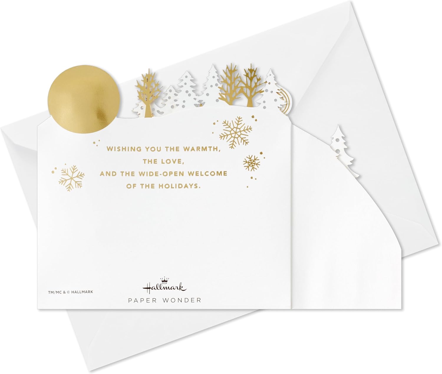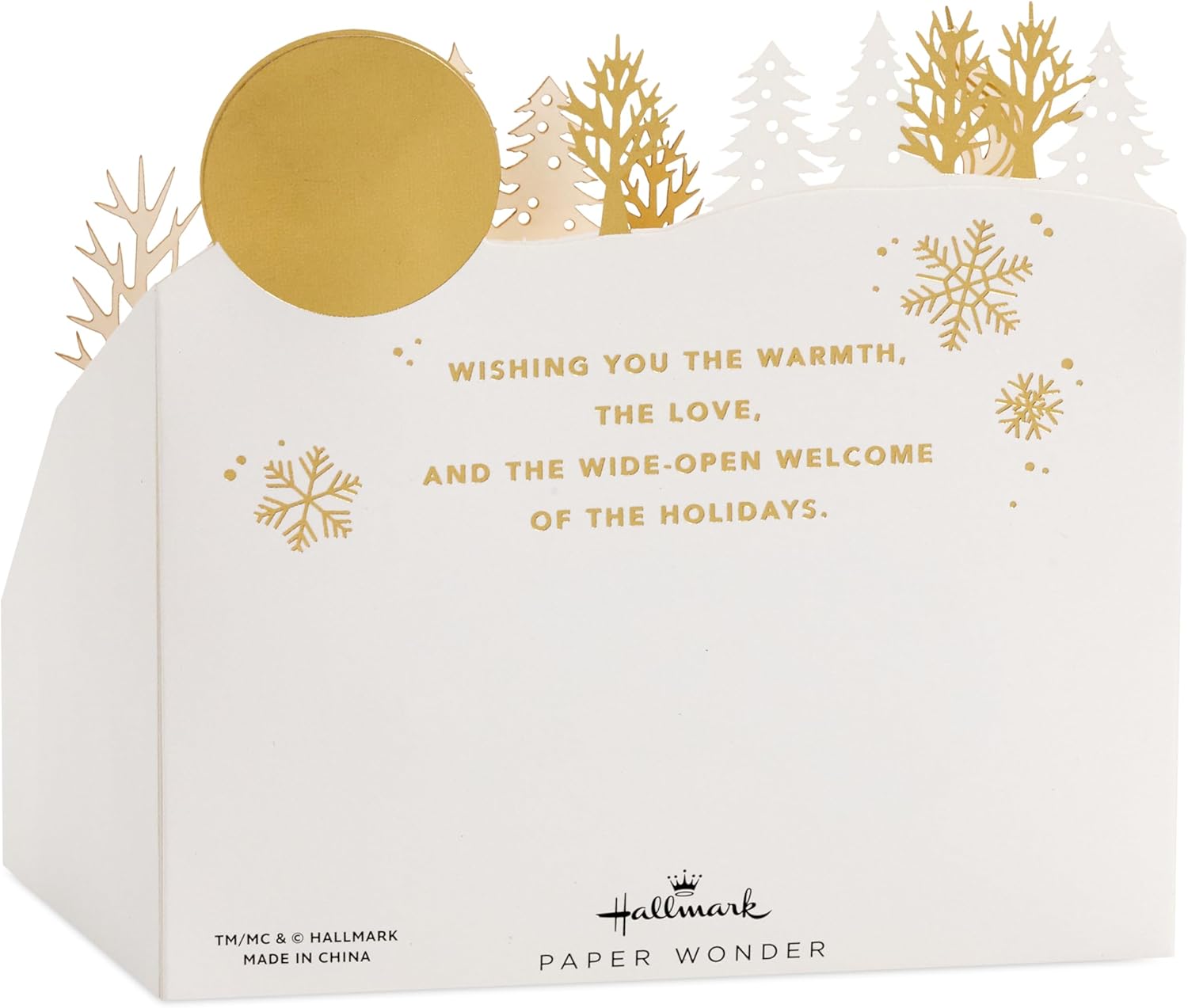 CHRISTMAS CARD: Add a touch of glam and elegance to their home this Christmas time, and gift them a card they'll love with this gorgeous 3D and pop up Christmas card with a winter wonderland design from Hallmark. Perfect for the festive season. 3D CHRISTMAS CARD: This card pops-up into a 3D display of Winter wonderland, features metallic gold foil details, laser cut details, the message, 'A Winter wonderland', and plays a joyful instrumental song and lights up when you press the button. HIGH QUALITY CONSTRUCTION: This product is made using material from well-managed, FSC-certified forests and other controlled sources. FESTIVE MESSAGE: Bring them lots of festive love and the joy of the season with a heartfelt message in the space provided, and pair your words with our festive message 'Wishing you the warmth, the love and the wide-open welcome of the holidays' CARD SIZE: Flat card measures H20.2cm by W13.8cm, constructed card measures H13.8cm x W14cm.2 x D6cm, perfect to display. This card is accompanied with a Hallmark branded, White envelope. Within UK 'Large Letter' Postage Size Limits.