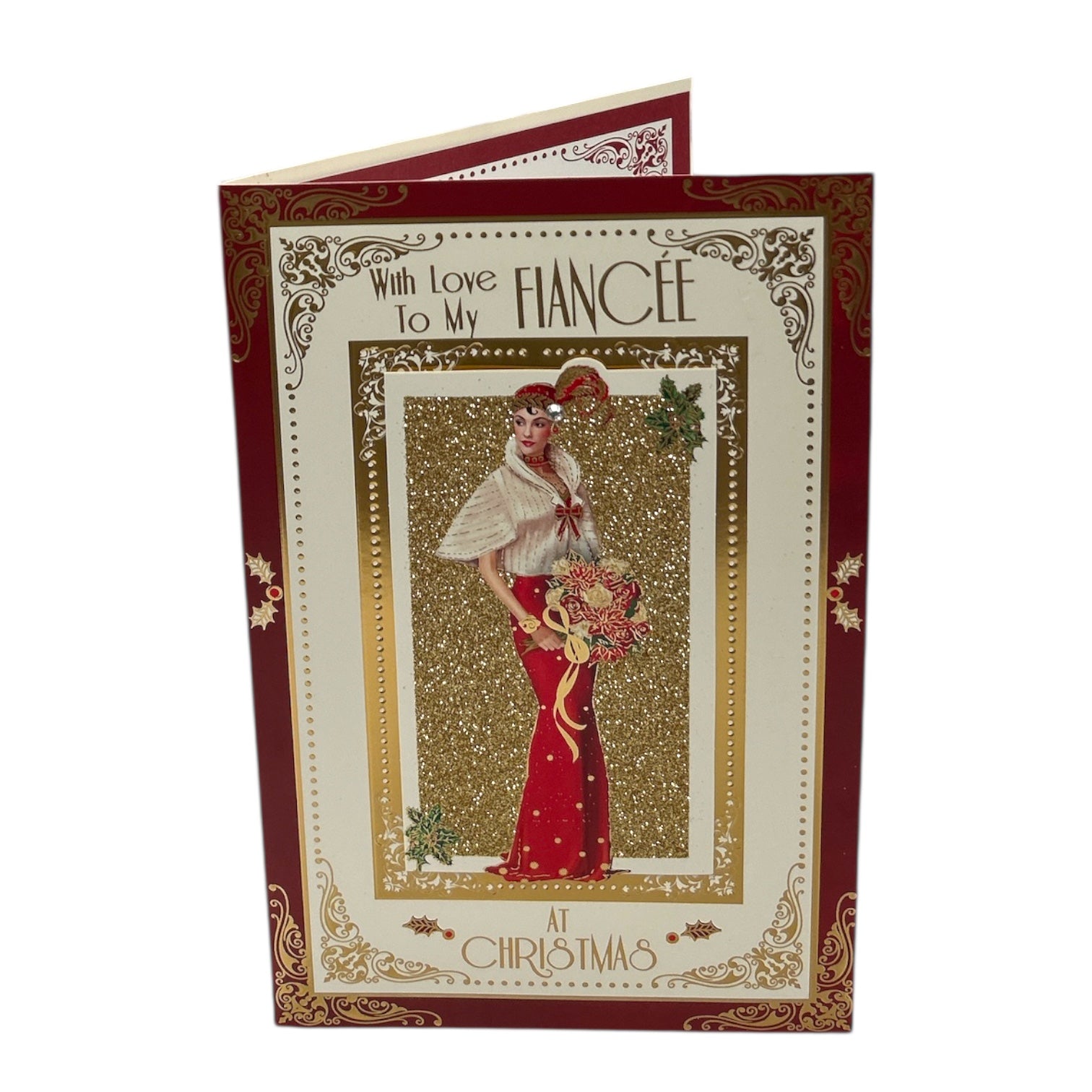 To My Fiancée Elegant Woman Holding Flowers Design Christmas Card