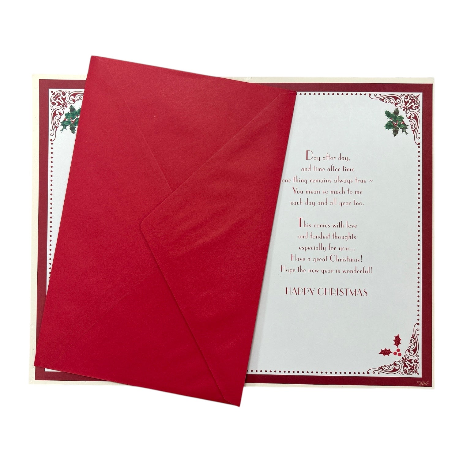 This beautifully designed Christmas card features a vintage-inspired illustration of an elegant woman holding a bouquet of flowers, set within an ornate gold and red border. The background shimmers with a gold glitter effect, adding a touch of glamour and richness to the design. Intricate border detailing enhances the sophisticated style, while the soft ambient glow captures the festive spirit. Perfect for conveying love and elegance this Christmas, the card is both timeless and celebratory. Approx. size 275 x 175mm, supplied with a coordinating envelope.