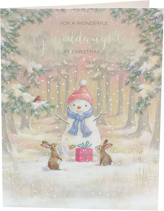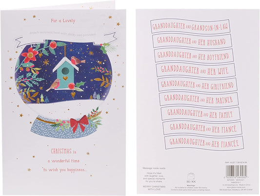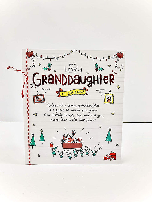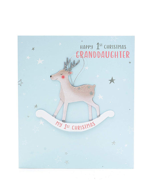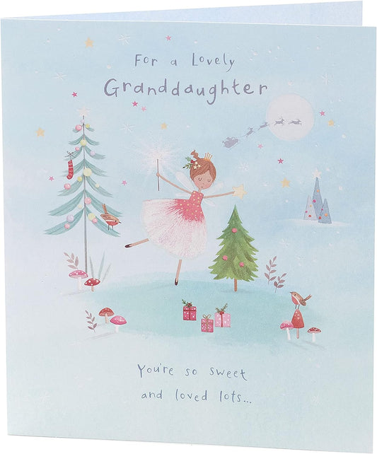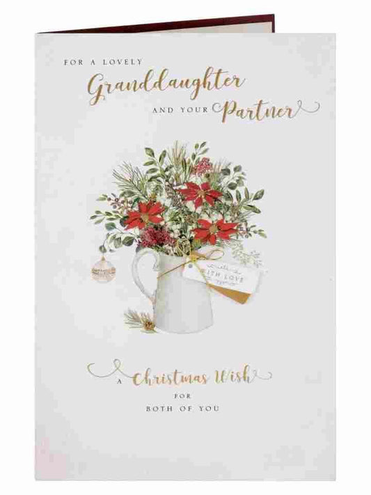 This festive Christmas card is a warm and elegant way to send seasonal wishes to a dear granddaughter and her family. The design features rich red and gold ornaments nestled among lush green pine branches, with a radiant star at the center symbolizing holiday magic. Ornate corner flourishes and glitter accents add a luxurious touch, making the card visually striking and emotionally meaningful. The message “Happy Christmas” is beautifully scripted, offering a heartfelt greeting that reflects love, joy, and togetherness. Perfect for expressing appreciation and warmth during the holidays, this card blends traditional motifs with refined detailing. Its premium finish and classic color palette make it ideal for gifting or catalog presentation. Whether displayed or sent with love, it’s sure to be cherished. Approximate size: 225 x 155 mm.