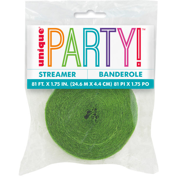 81ft Lime Green Crepe Streamer. This classic crepe streamer design can easily mix and match with your other colourful decorations. This product is perfect for weddings, events, banquets, and decoration for parties. This product is made of quality crepe paper that is easy to assemble and use. Made with environment friendly crepe paper that is disposable and biodegradable. Size 81ft x 1.75inches.