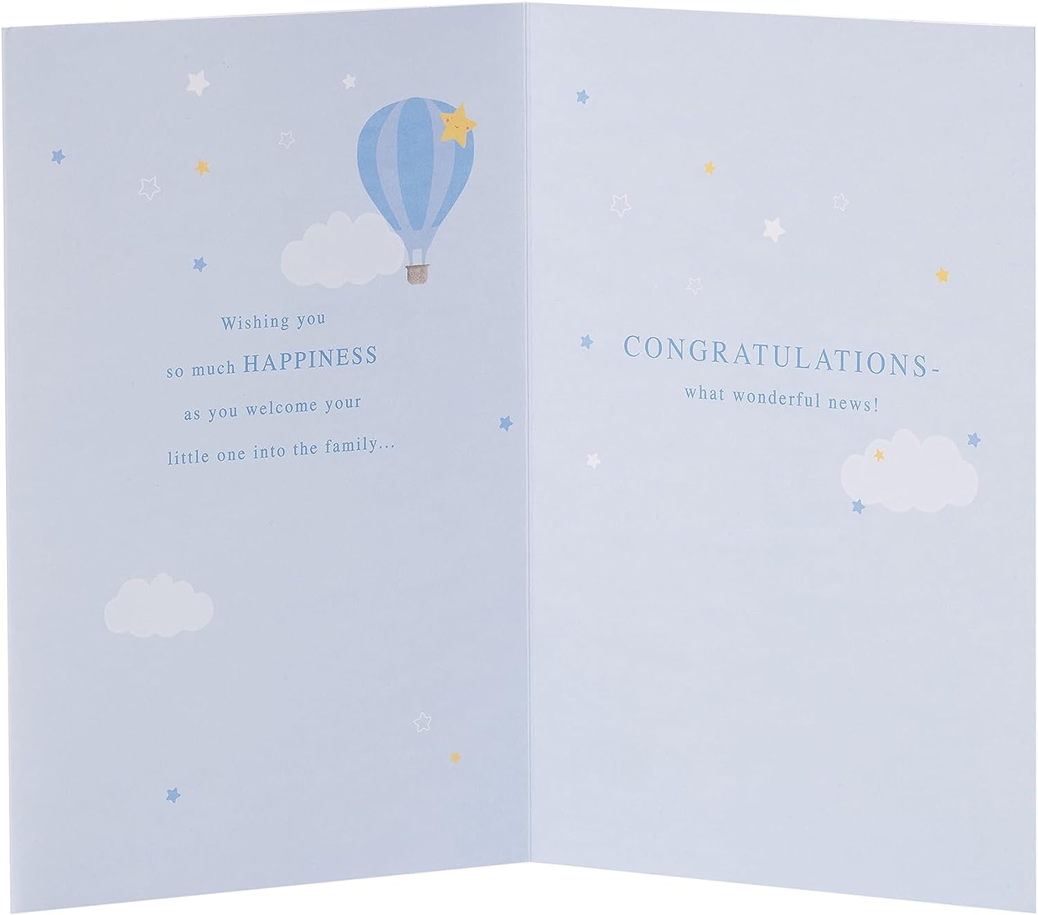 Welcome the new baby boy to the world with this cute fold-out Birth Congratulations card featuring a star and moon design. Message Inside Reads: Congratulations - what wonderful news! Card Size: 149mm x 229mm. Envelope Included.