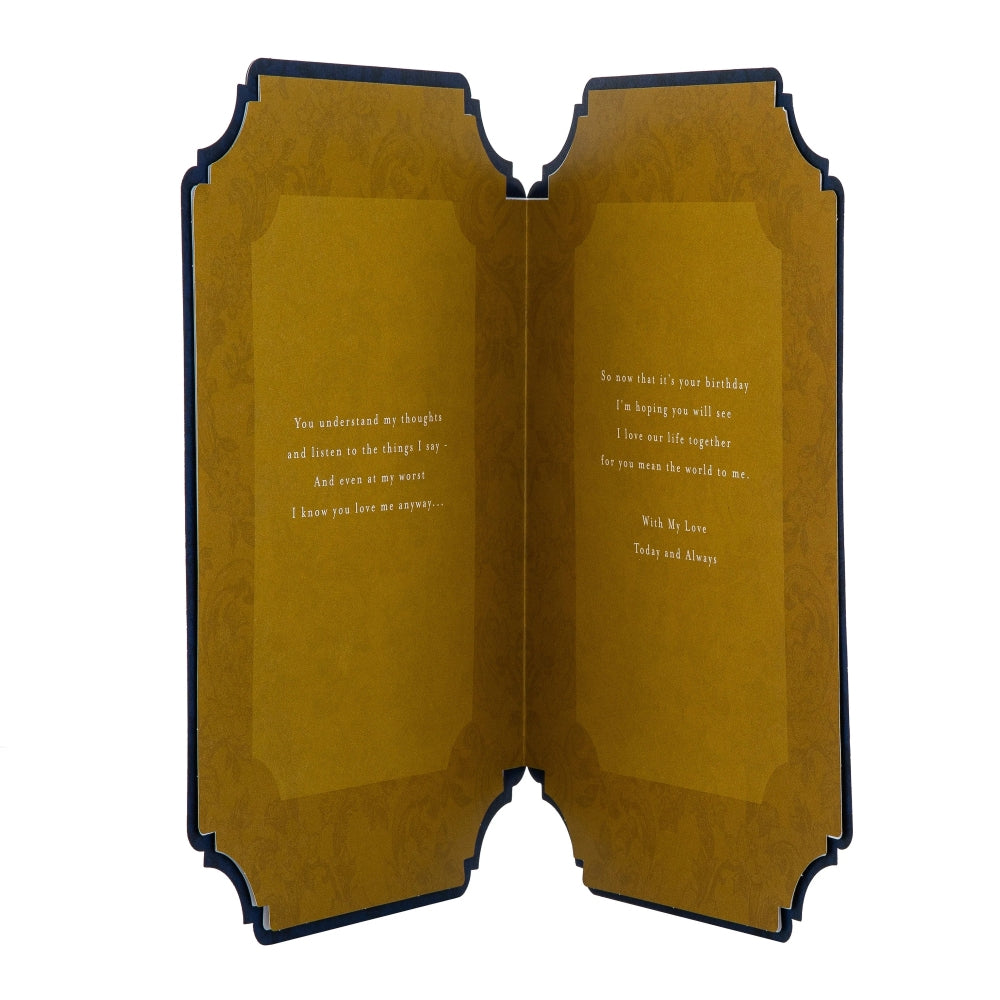 Send all your love and make your husband feel extra special on his birthday, with this stunning birthday card from our Maurice Moore collection. The perfect way to send a heartfelt note and fill his day with love. Printed on high-quality textured board, this card has a wonderful Blue with traditional floral design with a sentimental quote and features die-cut corners, a paper insert, embossed elements, metallic gold foil details 3D heart paper charm attachments, a die-cut 3D attachment, and the message 'For My Husband, Happy Birthday. You're such a special husband and I know without a doubt your tender love is something I could never do without - you have the biggest, kindest heart that I have ever known, it always makes me proud to feel that I am yours alone...' on the front. This card comes complete with a Hallmark branded, cream envelope. This card is fully recyclable, and made of material from well-managed, FSC®-certified forests and other controlled sources. Message Inside Reads: You understand my thoughts and listen to the things I say - and even at my worst I know you love me anyway… So now that it's your birthday I'm hoping you will see I love our life together for you mean the world to me. With My Love Today and Always Card Measures: H26cm by W18cm. Within UK 'Large Letter' Postage Size Limits.