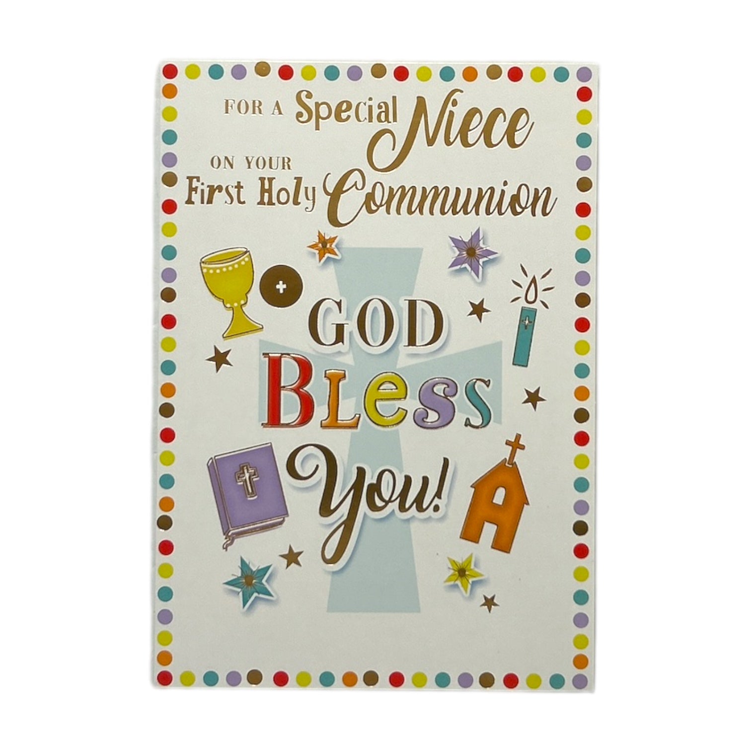 This beautiful and uplifting First Holy Communion card is designed to celebrate a special niece on her sacred milestone. The card features a light beige background, with a soft light blue center that highlights the heartfelt message "GOD BLESS YOU!" in vibrant, colorful lettering. Surrounding the text are delicate religious symbols, including a golden chalice, a cross, a holy book, and a small church, representing faith, devotion, and divine guidance. The card is framed with a cheerful polka dot border in an array of bright colors, adding a festive and celebratory touch. The overall design is thoughtfully arranged, ensuring that the message is clear, meaningful, and visually appealing. Inside, a heartfelt blessing offers prayers and warm wishes for a future filled with faith, love, and the Lord’s guidance. The card comes with a coordinating envelope. Card size: Approx. 19.5 x 14 cm.