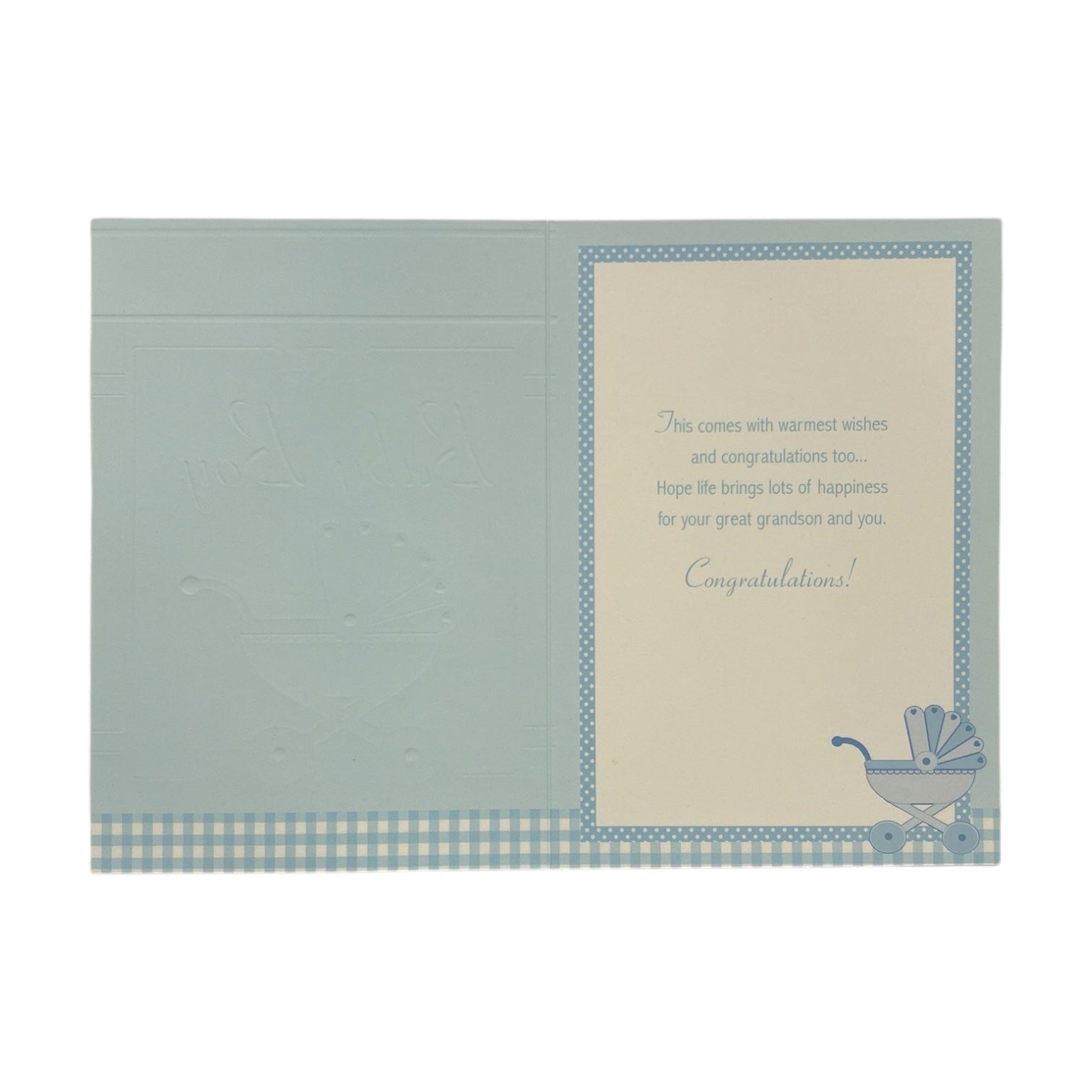 greeting card designed to congratulate the arrival of a lovely new great-grandson. The card features a soft blue color scheme with delicate polka dot and gingham patterns, creating a sweet and charming look. The centerpiece is an illustration of a classic baby carriage, and an elegant gold script. It comes complete with a coordinating envelope. Card size: Approx. 19.5 x 14 cm.