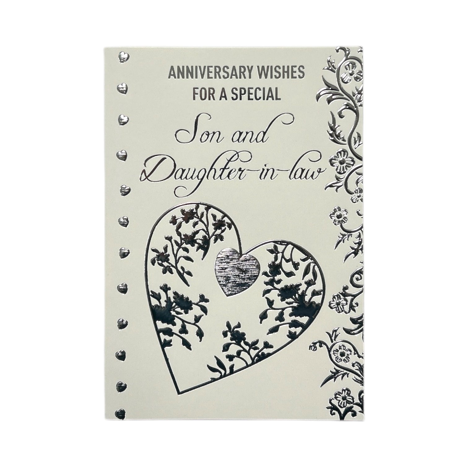 This is a "Son and Daughter-in-Law Anniversary" greeting card designed to celebrate their special day. The card features an elegant cream-colored background with delicate black floral patterns along the edge. A beautifully embossed silver heart with intricate details is at the center, adorned with soft pink flowers for a romantic touch. It comes complete with a coordinating envelope. Card size: Approx. 19.5 x 14 cm.