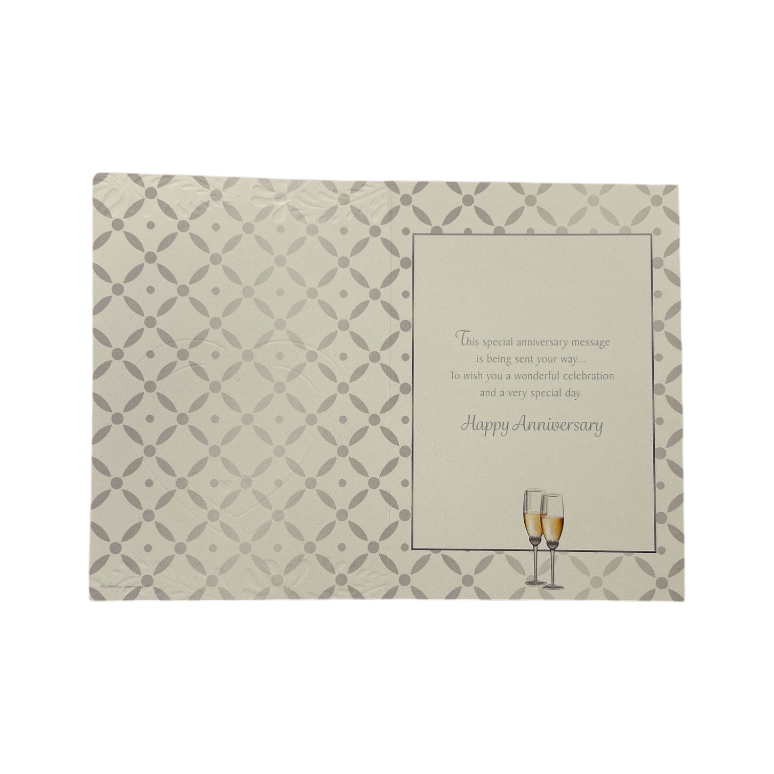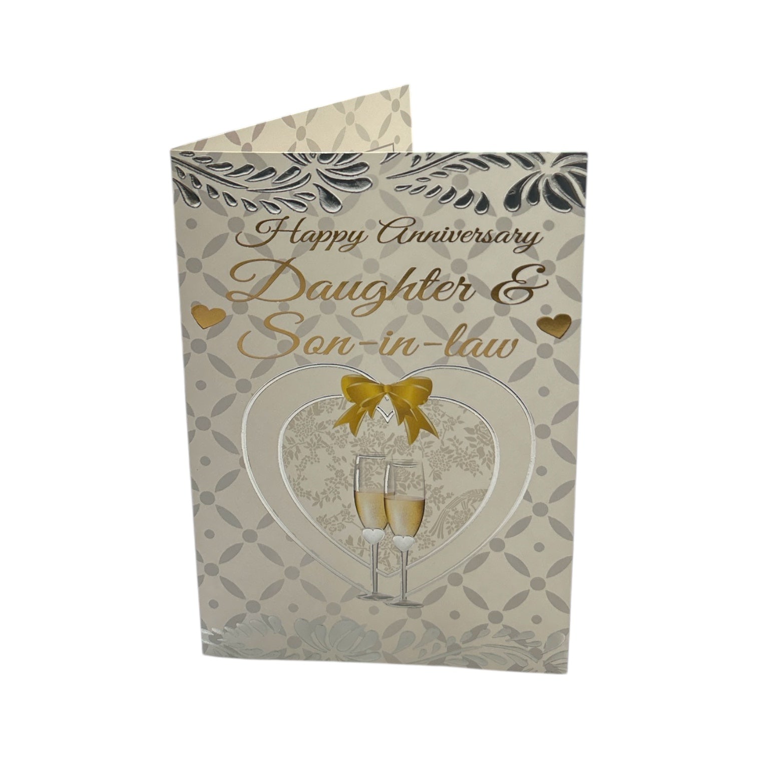 This elegant Daughter & Son-in-Law Anniversary Card features a light beige base with a beautifully designed heart-shaped frame at the center. Within the frame, two champagne flutes are delicately illustrated, as if toasting in celebration. The background showcases a subtle embossed pattern, adding texture and sophistication. Silver and gold detailing enhance the design, while a golden ribbon provides a graceful contrast. The muted pastel tones create a soft, romantic ambiance. The heartfelt message, "Happy Anniversary Daughter & Son-in-Law," is prominently displayed, making this card a perfect way to convey warm wishes on their special day. Inside, thoughtful anniversary wishes complete the sentiment. The card comes with a coordinating envelope. Card size: Approx. 19.5 x 14 cm.