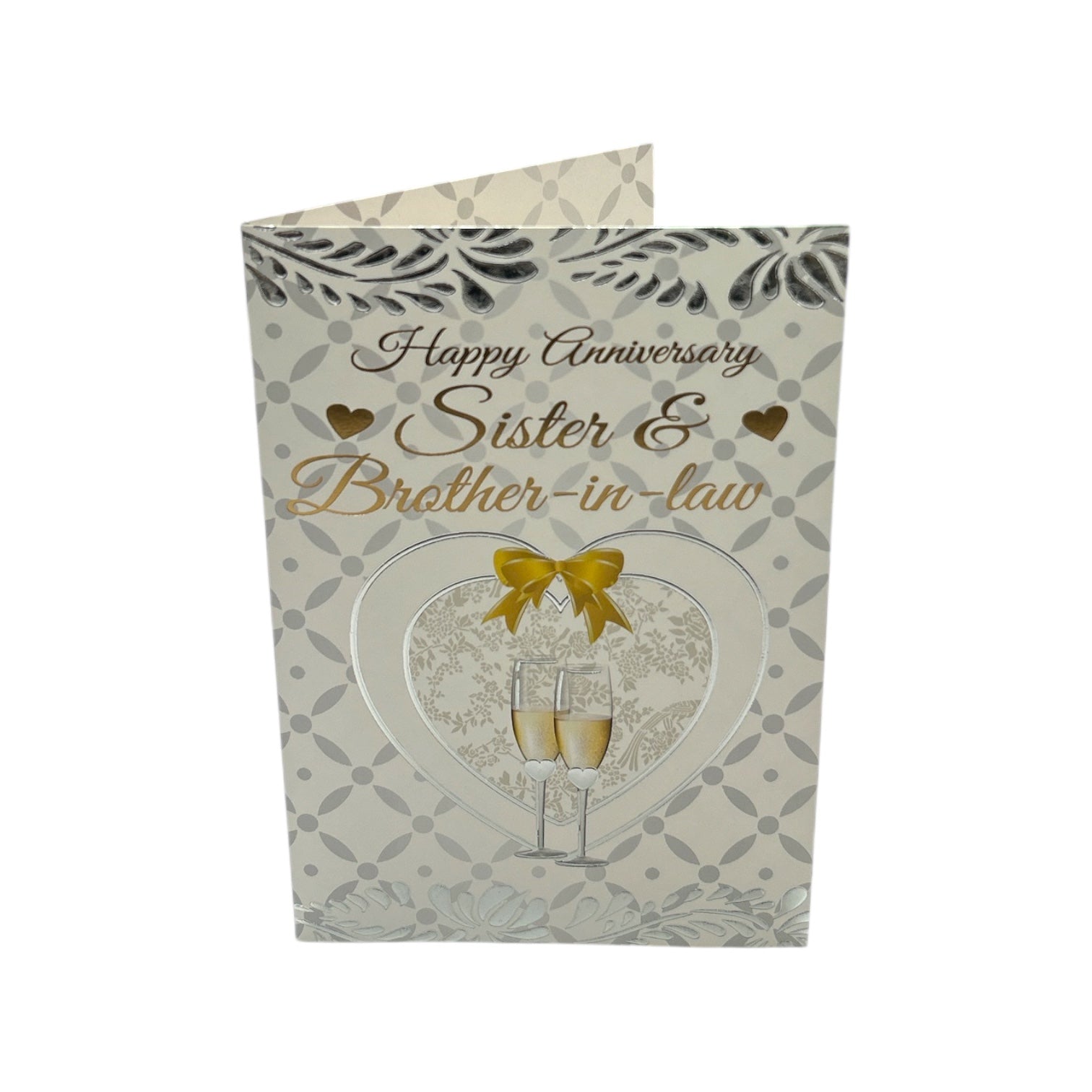 This elegant Sister & Brother-in-Law Anniversary Card features a light beige base with a beautifully designed heart-shaped frame at the center. Within the frame, two champagne flutes are delicately illustrated, as if toasting in celebration. The background showcases a subtle embossed pattern, adding texture and sophistication. Silver and gold detailing enhance the design, while a golden ribbon provides a graceful contrast. The muted pastel tones create a soft, romantic ambiance. The heartfelt message, "Happy Anniversary Sister & Brother-in-Law," is prominently displayed, making this card a perfect way to convey warm wishes on their special day. Inside, thoughtful anniversary wishes complete the sentiment. The card comes with a coordinating envelope. Card size: Approx. 19.5 x 14 cm.