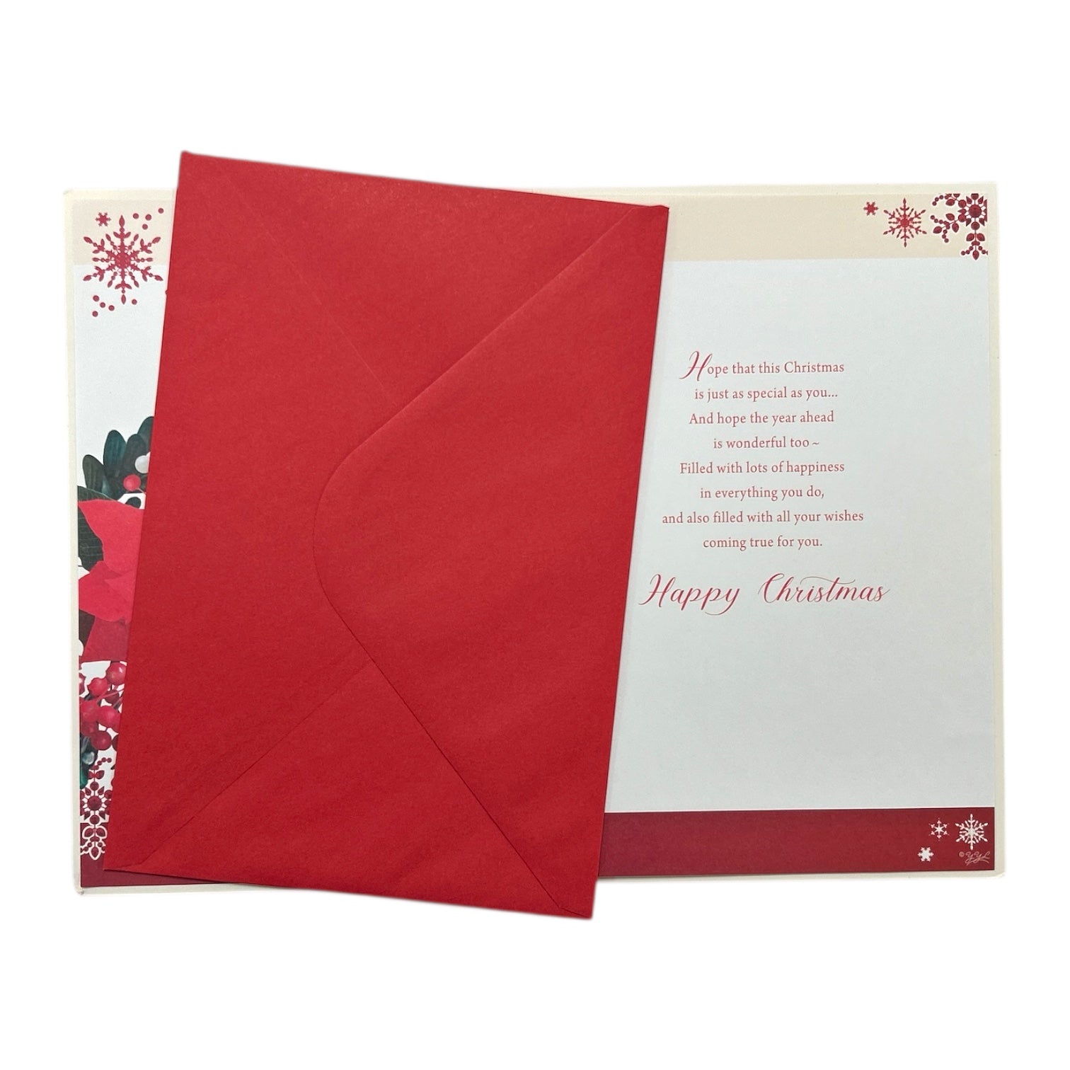 For a Special Sister-in-Law Poinsettia Design Christmas Card – This festive card features a striking red poinsettia flower design, beautifully accented with gold glitter and delicate snowflakes. The rich red and gold color scheme evokes traditional holiday cheer, while the snowflake details add a touch of winter charm. Radiating warmth and joy, this card perfectly captures the spirit of Christmas celebration. Approx. size 225 x 155mm, and it comes with a coordinating envelope.