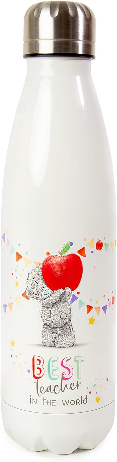 REUSABLE WATER BOTTLE - ideal for cold drinks such as water, juice or squash, this practical bottle has a carefully designed screw-on lid to protect against accidental drips or spills SLIM DESIGN - this streamlined drinks bottle is the ideal size for slipping into a work bag or keeping on a desk, while still offering a generous capacity to stay refreshed throughout the day. ORIGINAL ARTWORK - the adorable illustration on the side of the water bottle features Tatty Teddy holding a huge red apple amidst a colourful background of bunting and polka dots. AFFECTIONATE MESSAGE - the inscription on the bottle reads 'Best teacher in the world'; the perfect sentiment for a teacher who goes above and beyond! HANDWASH IN WARM WATER - clean with mild detergent. Not suitable for use in the dishwasher.