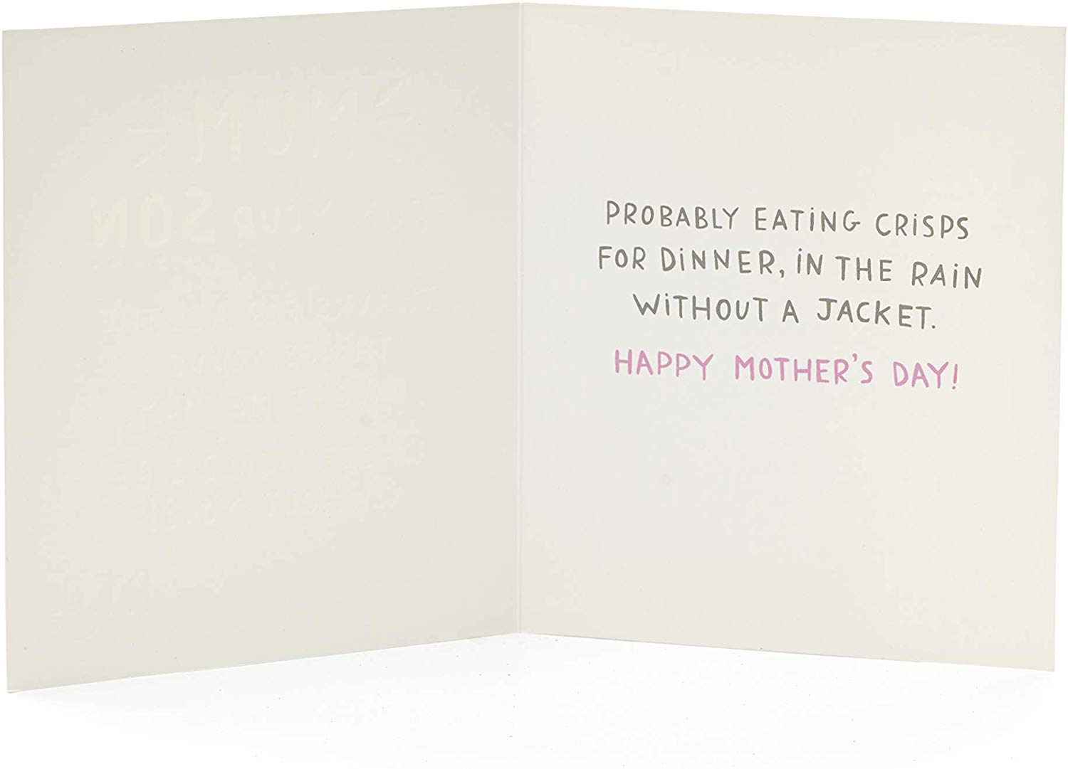 Make your mum smile, and let her know how grateful her son is this Mother’s Day, with this funny, complimentary humour card. Editorial inside reads: Probably eating crisps for dinner, in the rain without a jacket. Happy Mother's Day. Envelope included.