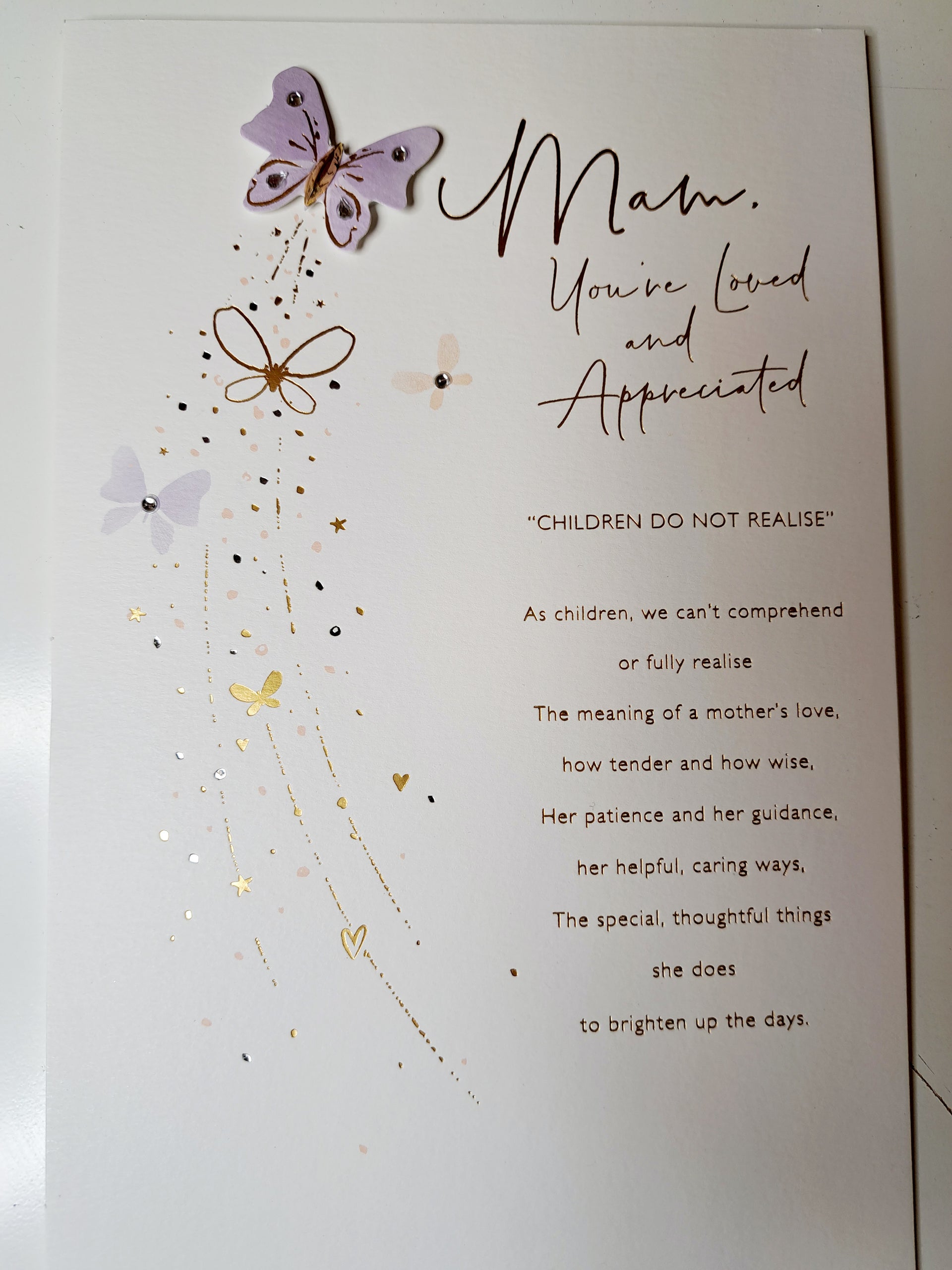 Tell a lovely mum how much you appreciate everything she’s done for you over the years with this sentimental Daydreams rhyming card. With a 3D butterfly, stunning foil accents and sparkling gems, it’s everything a wonderful mum deserves this Mother’s Day. Inside Message Reads: Years go by, before we know the depth of her concern, The love in her protectiveness - it takes so long to learn... Inside Message Continued: But as we grow, we understand, for we look back and see, Through older eyes and wiser hearts, her love and loyalty. It's these and many other things that make her grow more dear, More admired and more appreciated with every passing year. Inside Message Continued: You're a wonderful mum and you're loved more than you could know. Happy Mother's Day. Card Size: 165mm x 254mm.