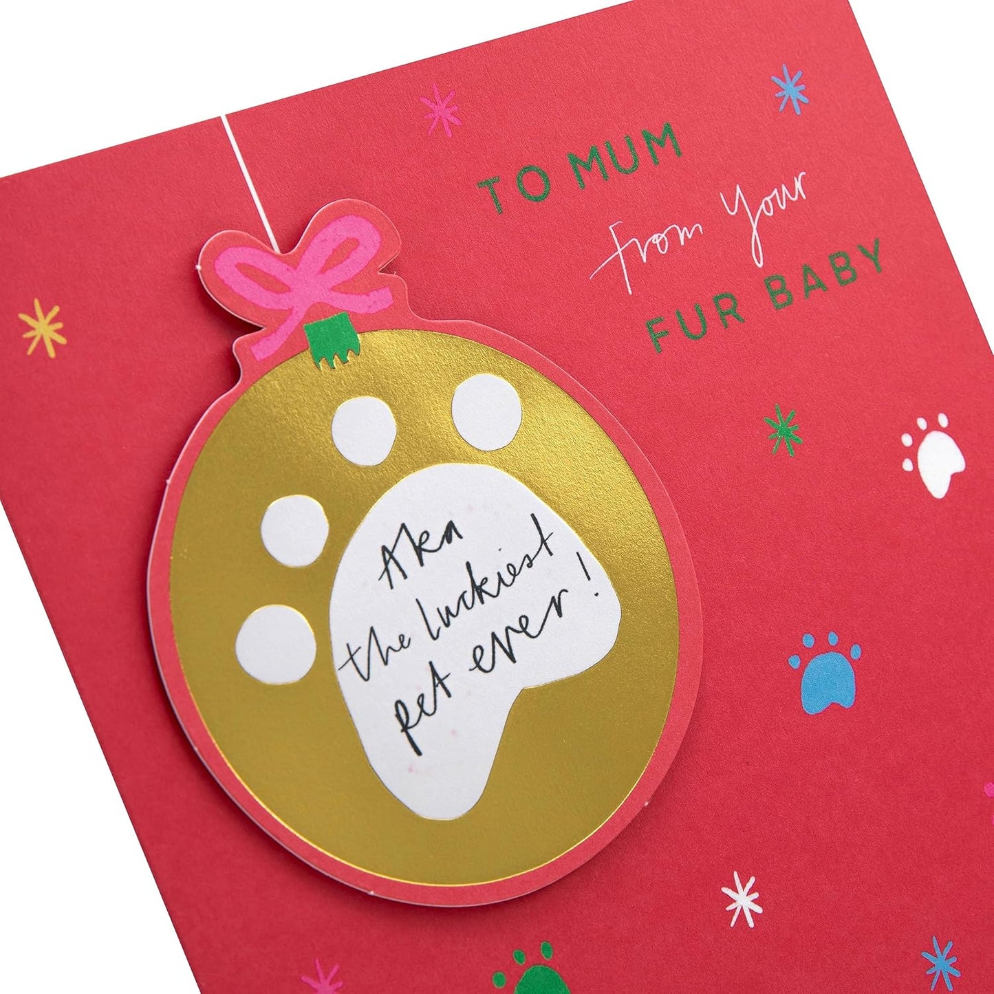 Let your pet show their paw-preciation to their favourite paw-rent this Christmas with this paw-sitively adorable card from Hallmark. This card is fully recyclable, and made of material from well-managed, FSC-certified forests and other controlled sources Printed on high-quality board with a fetching 3D paw-print bauble attachment and gold foil details; the card comes complete with a co-ordinating Kraft, Hallmark Branded Envelope. Message Inside Reads: Merry Christmas. Measures 16 cm by 16 cm, Within Standard UK 'Letter' Size Limits