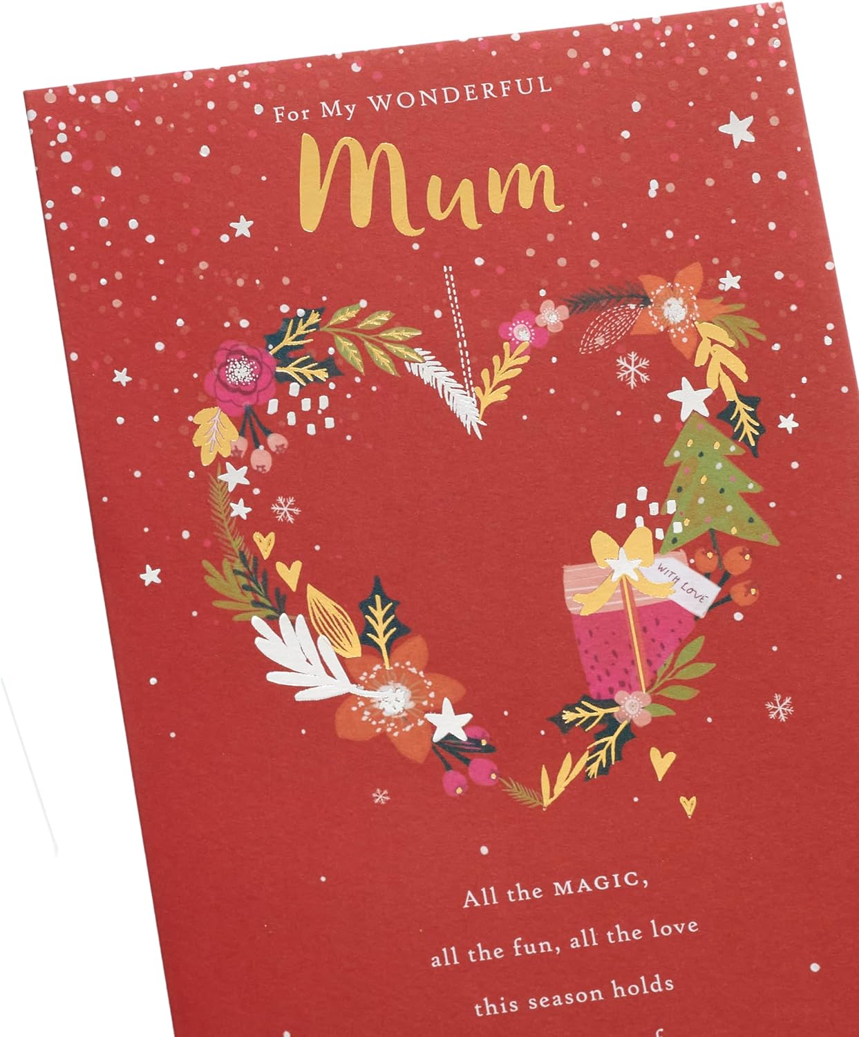 Thank your mum for always making Christmas special with this heartfelt card, featuring a heart-shaped wreath design finished with metallic foils. Message Inside Reads: Thanks, Mum, for always making Christmas so special! Wishing You a Very Merry Christmas With Love. Card Size: 149mm x 229mm. Envelope Included.
