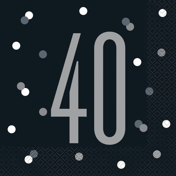 Pack of 16 Birthday Black & Silver Glitz Number 40 Luncheon Napkins. Create a stylish buffet table with these napkins and let the guests wipe spills and stains from the party food. These napkins are ideal for Birthday parties and match them with other party supplies and decorations. These napkins are made of durable paper that is strong enough to wipe the spills and stains. These disposable napkins make cleaning up quick and convenient.