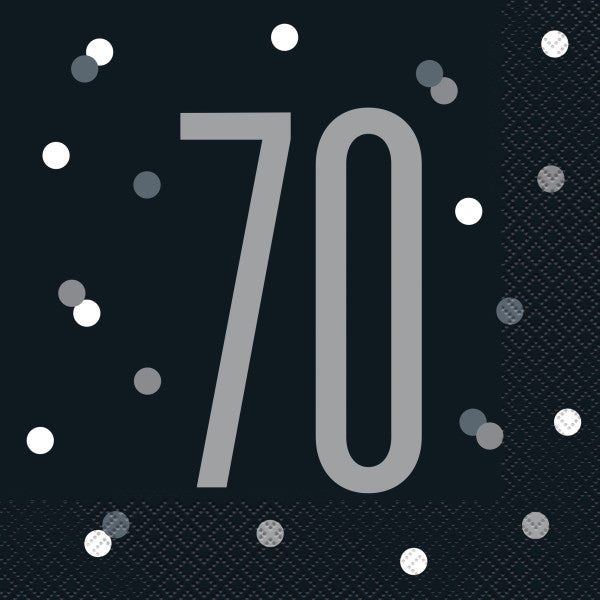Pack of 16 Birthday Black & Silver Glitz Number 70 Luncheon Napkins. Put the finishing touch on your party table setting with these luncheon napkins. These napkins feature a number "70" text and dots design in black background. Make cleanup a breeze with disposable paper napkins.