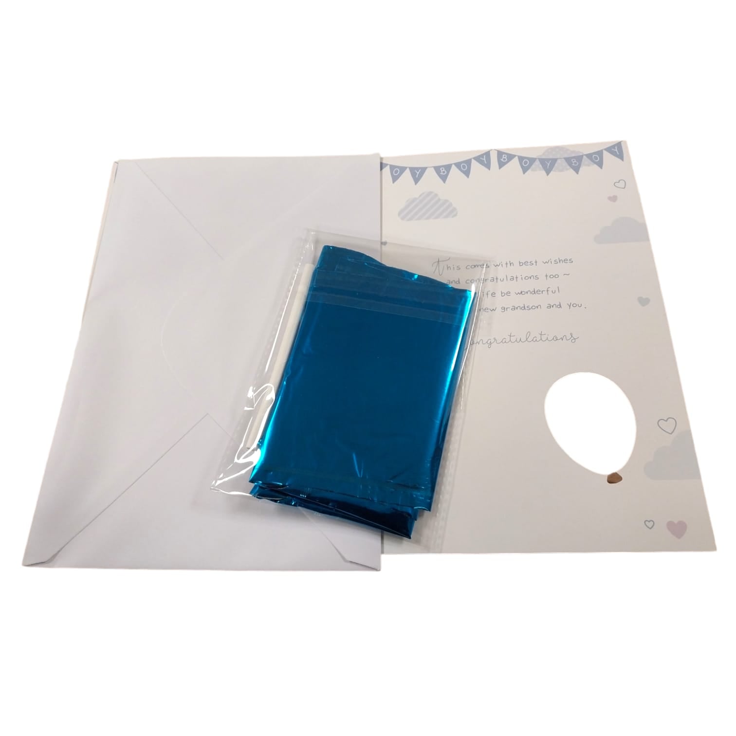 Welcome your grandson into the world with a burst of color and charm! Our Balloon Boutique greeting card is designed to make your heartfelt congratulations truly memorable. The four blue foil "BABY" balloons add a delightful pop to the celebration, creating a scene of joy and happiness. These balloons are intended for air filling only and are not suitable for helium. Along with the balloons, the card includes a straw for inflating the balloons and 2 meters of ribbon for hanging them. These accessories make it easy to set up the balloon display, adding convenience to the overall gifting experience. Size of card 230x150mm. Send your warmest wishes and blessings to the new addition to your family with our Balloon Boutique Greeting Card.