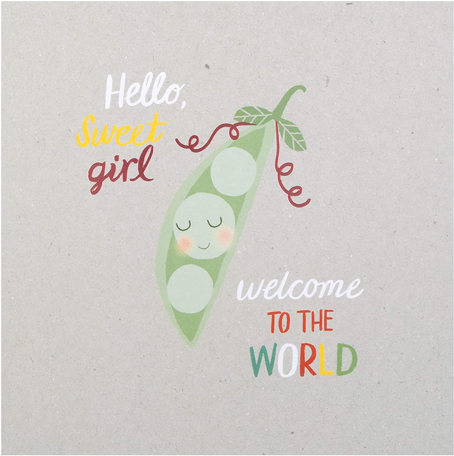 Welcome a sweet little girl to the world and congratulate her parents with this adorable card from Hallmark. Textured board. Pink Foil lettering. Plain white Envelope. Message reads: front: Hello, sweet girl welcome to the world inside: biggest congratulations. Measures 16cm by 16cm, within Standard UK 'Letter' Size limits.