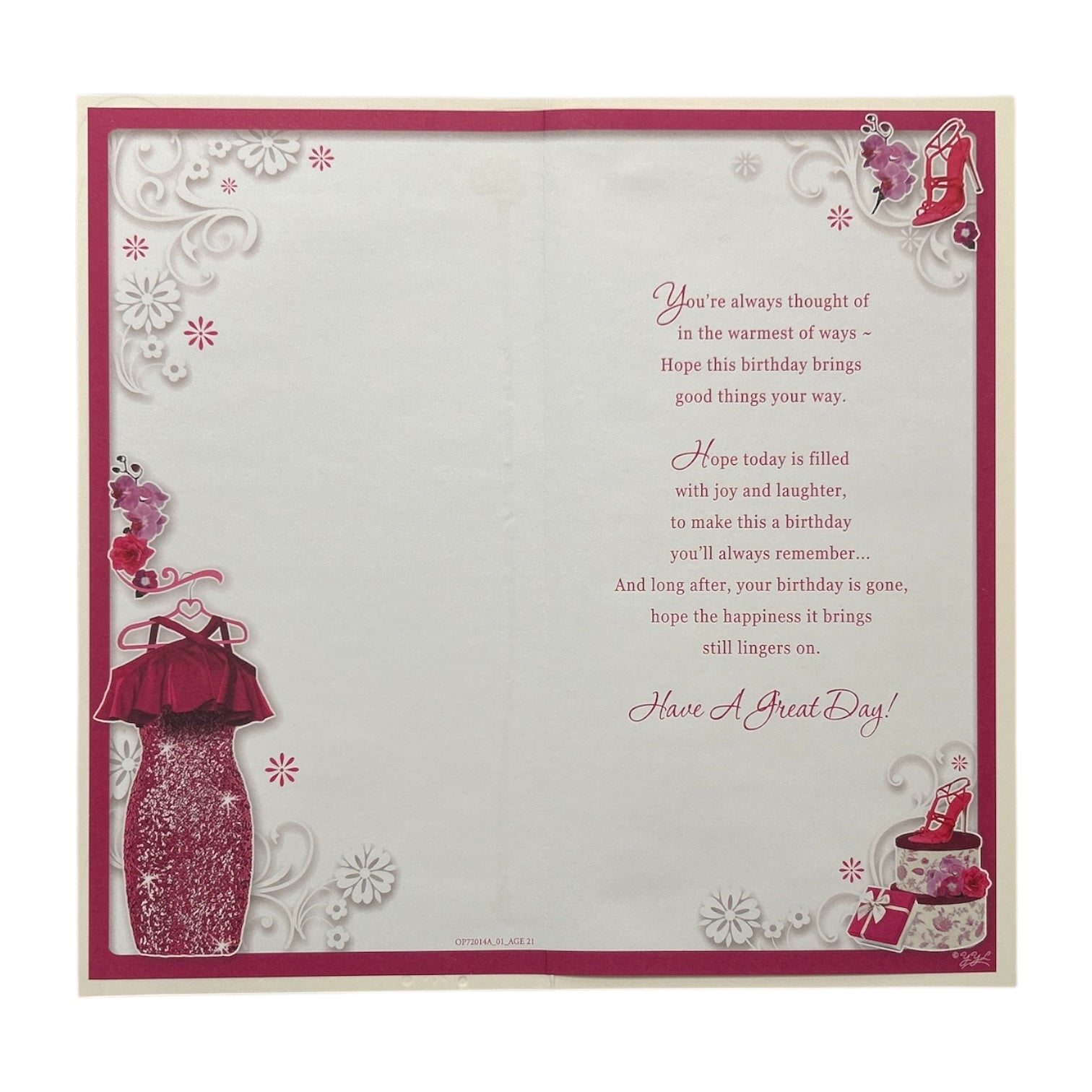 Celebrate a milestone 21st birthday with this elegant and beautifully designed card. The front features a stylish pink dress paired with matching pink sandals, enhanced with delicate embossed details for a sophisticated touch. Shimmering foil accents add a touch of glamour, making the design truly stand out. A lovely verse graces the front, while the inside continues with the same elegant design and heartfelt birthday wishes. The card comes with a coordinating envelope. Approximate size: 9" x 4.75" (23 cm x 12 cm).