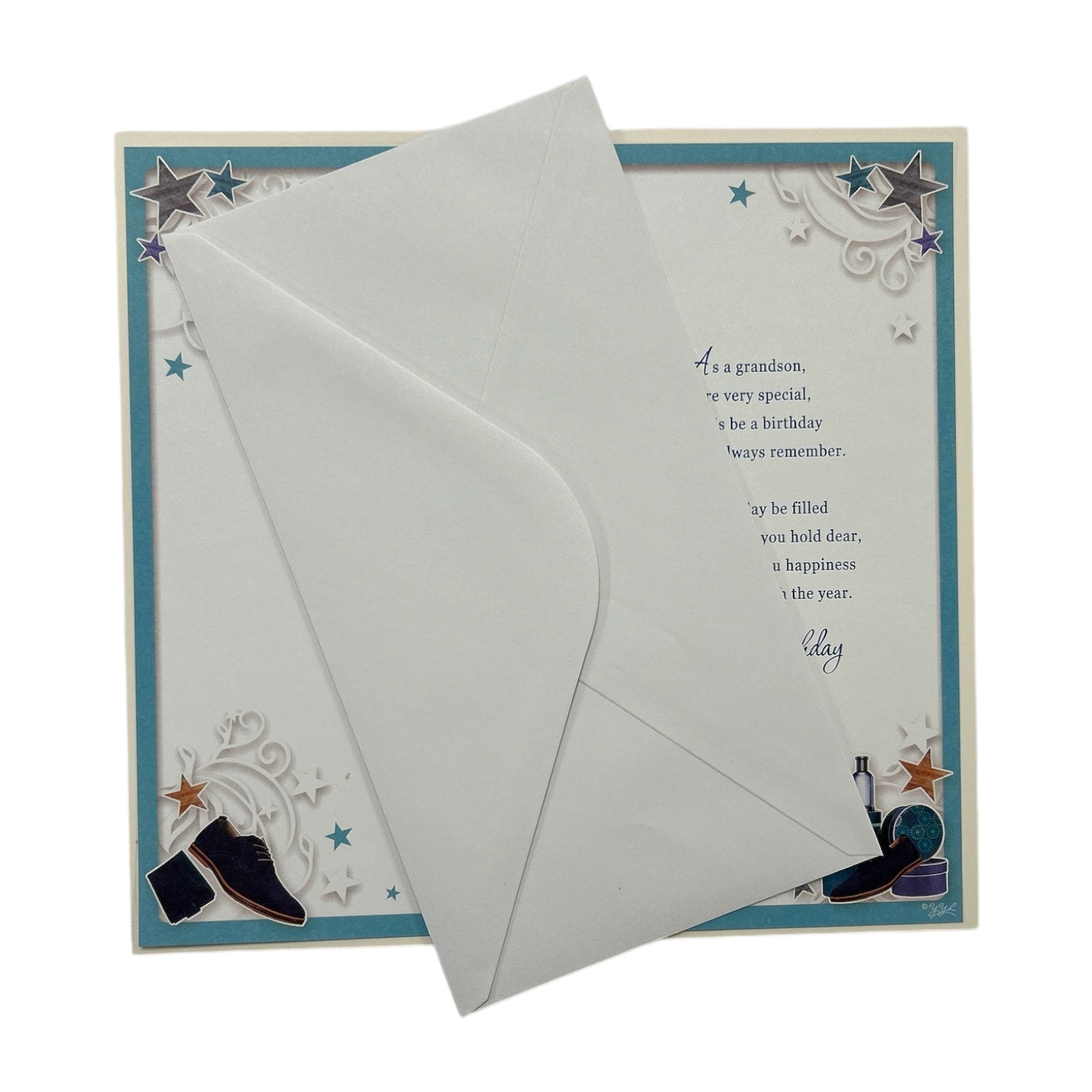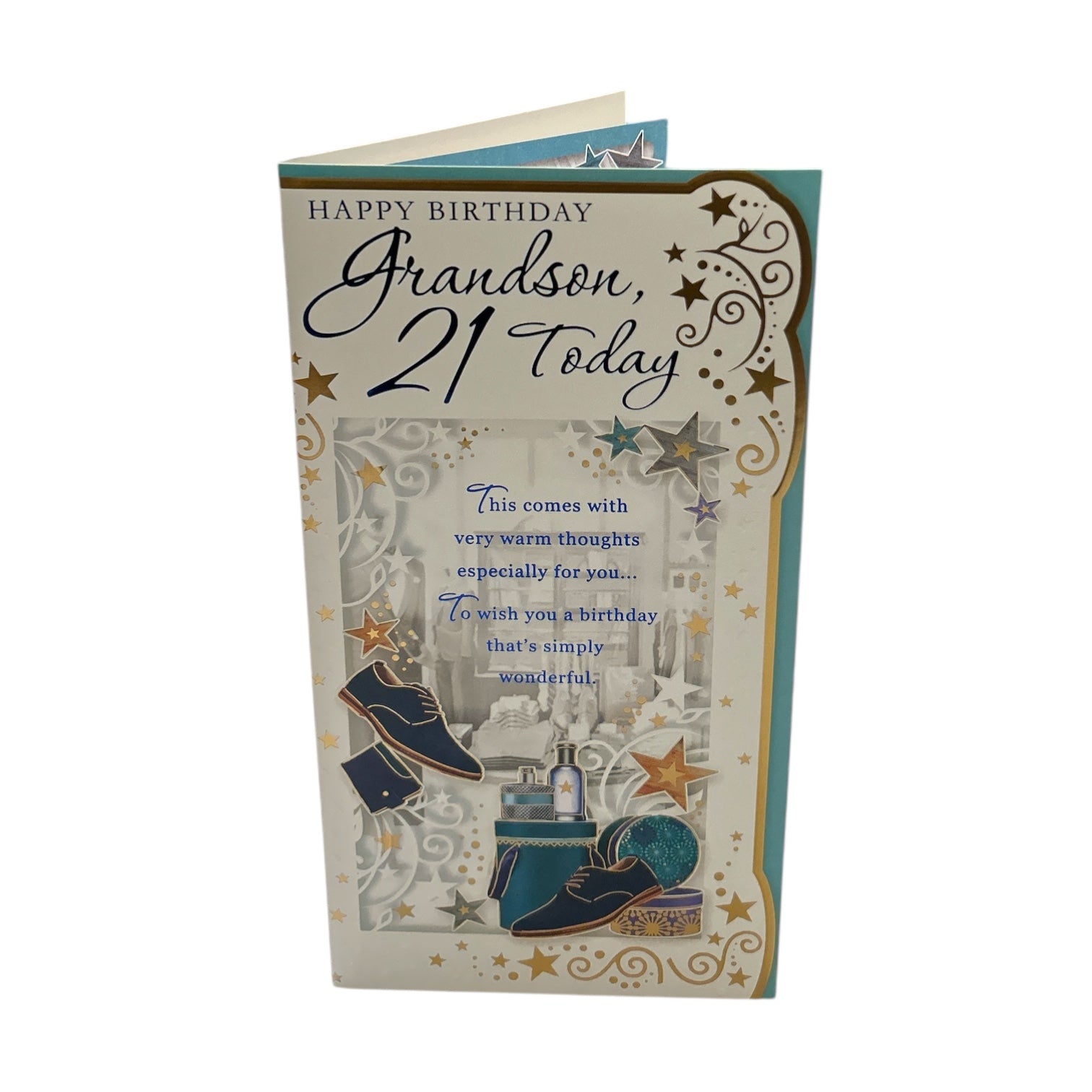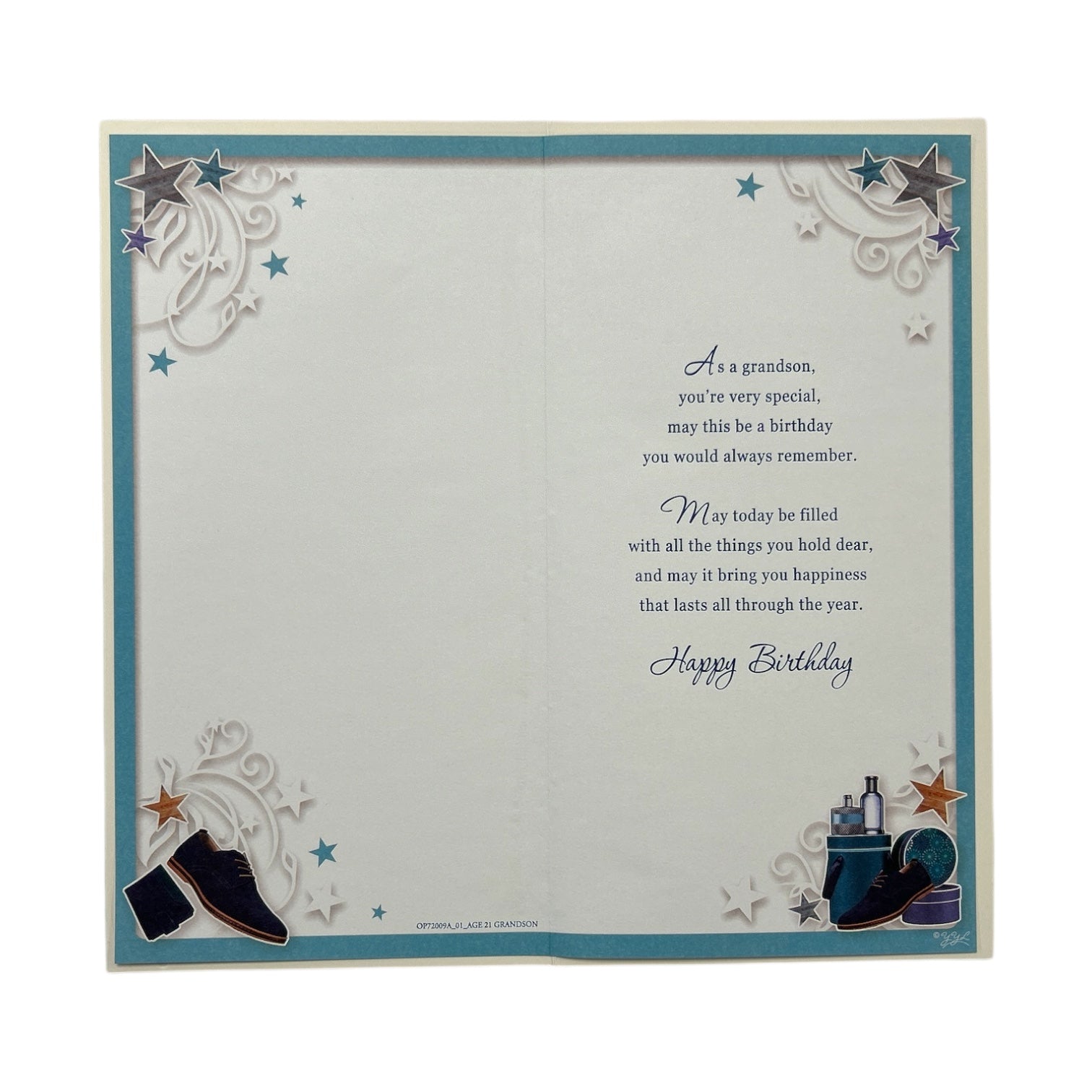 Celebrate your grandson’s milestone 21st birthday with this stylish and sophisticated card. The front features an elegant embossed design of blue formal shoes paired with a classic perfume bottle, symbolizing maturity and style. A lovely verse is featured on the front, while the inside continues with the same refined design, offering beautiful birthday wishes to make his day even more special. The card comes with a coordinating envelope. Approximate size: 9" x 4.75" (23 cm x 12 cm).