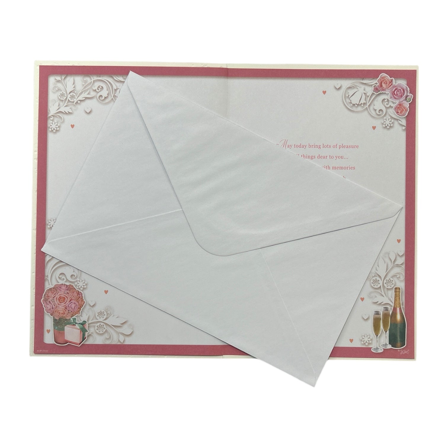 Mark a special anniversary with this beautifully designed greeting card, featuring a champagne bottle and glasses, symbolizing love, joy, and celebration. The front is adorned with an elegant gift box and a charming flower pot design, enhanced with intricate embossed floral details and luxurious foil accents, adding a touch of sophistication. Inside, the card continues with the same stunning design and includes heartfelt anniversary wishes, making it a cherished keepsake for the happy couple. Whether celebrating a milestone or simply honoring another year of love, this card is the perfect way to send warm wishes, love, and blessings on their special day. The card comes with a coordinating envelope. Approximate size: 9" x 4.75" (23 cm x 12 cm).