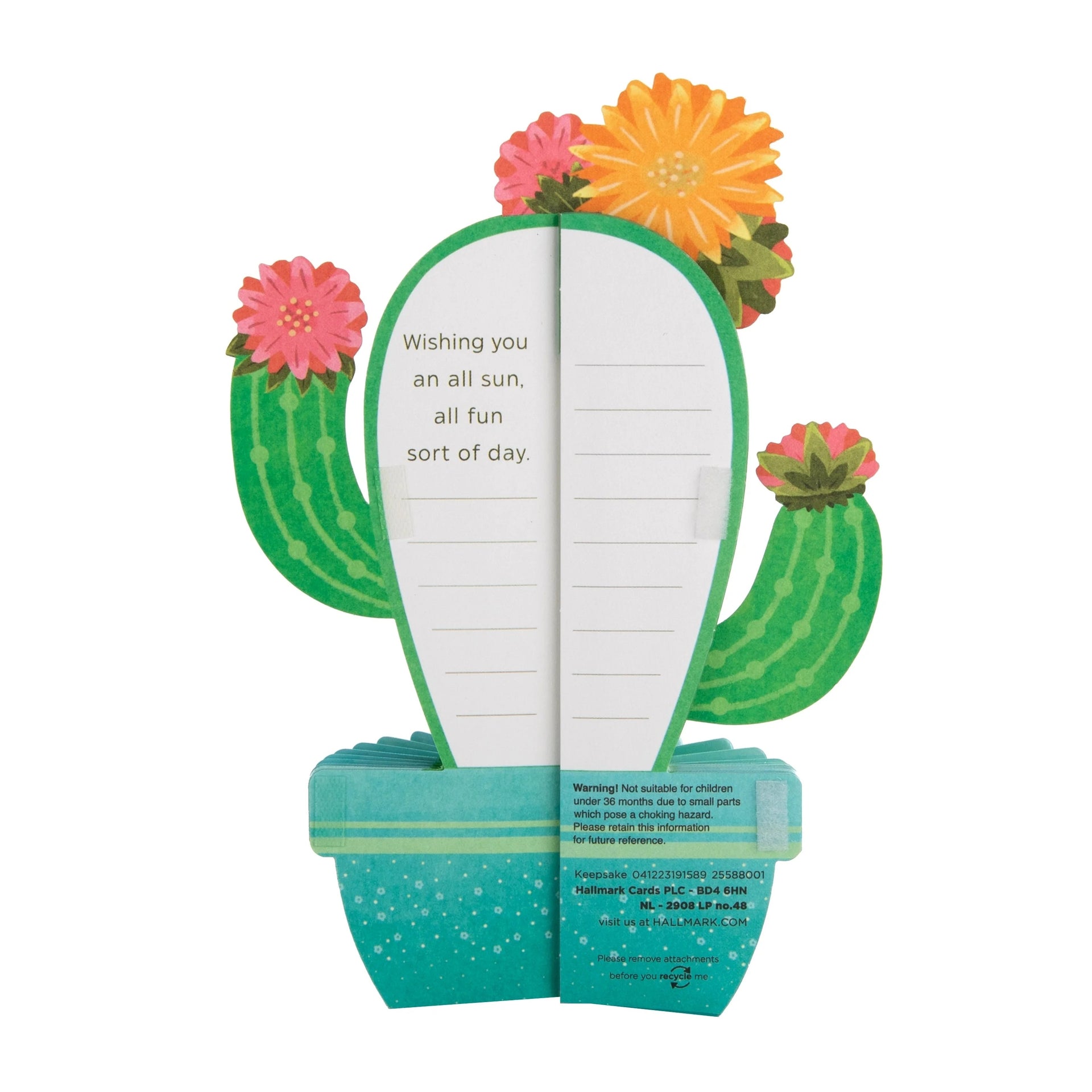 This card folds out into a wonderful 3D and pop-up diorama of a bloomed cactus in a pot, features the message "Hello" on the front, honeycomb paper, metallic gold foil details and comes complete with a co-ordinating Hallmark branded, pink envelope. Unfold and press together the Velcro tabs to assemble. Printed on high quality board, made of material from well-managed, FSC®-certified forests and other controlled sources. Remove attachments before recycling. Message Inside Reads: Wishing you an all sun, all fun sort of day Flat Card Measures: H17.3cm by W11.9cm, Constructed Card Measures: H17.3cm by W11.9cm by D9.1cm, Within UK 'Large Letter' Postage Size Limits.