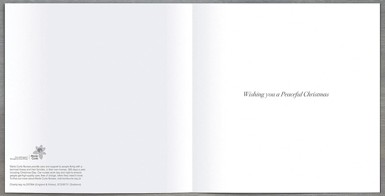 Fill their home with love and laughter this Christmas with this pack of 8 charity Christmas cards, supporting Marie Curie You are viewing: A pack of 8 Charity Christmas Cards featuring holly berries Occasion: Perfect to send at Christmas Message Inside: Wishing you a Peaceful Christmas Details: Each pack includes 8 cards in the same design and each purchase includes a charity donation of 50p per pack supporting Marie Curie Good to know: Made from sustainable card, each set of cards comes in a plastic free pack complete with white envelopes Card Sizes: Square 15.5cm x 15.5cm 5" x 5" Postal Size: Letter