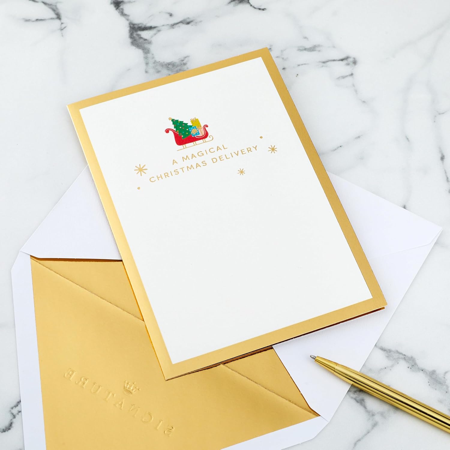 Bring the wonder of Santa's winter workshop to the centre of their home and let them feel this festive magic with this incredible and sweet 3D and pop up Christmas card from the Signature Paper Wonder collection. Simply open the card to reveal a 3D and pop up display of Santa's winter workshop scene featuring Santa, reindeer, sleigh, snowman, trees, and candy canes. This card features laser cut details and metallic gold foil details. This map is fully recyclable and is made from material sourced from well-managed, FSC certified forests and other controlled sources. Use the designated space to write your own Christmas wish to accompany our festive themed message: "Hope you get everything you're wishing for! and celebrate the people you love with the blessings and joy of the season. SIZE Flat this card measures 6.8" x 4.7" and 4" x 9.4" x 6.8" when assembled. Accompanied by a matching white envelope with Hallmark signature logo and metallic gold foil lining. Within UK bulk letter shipping size limits