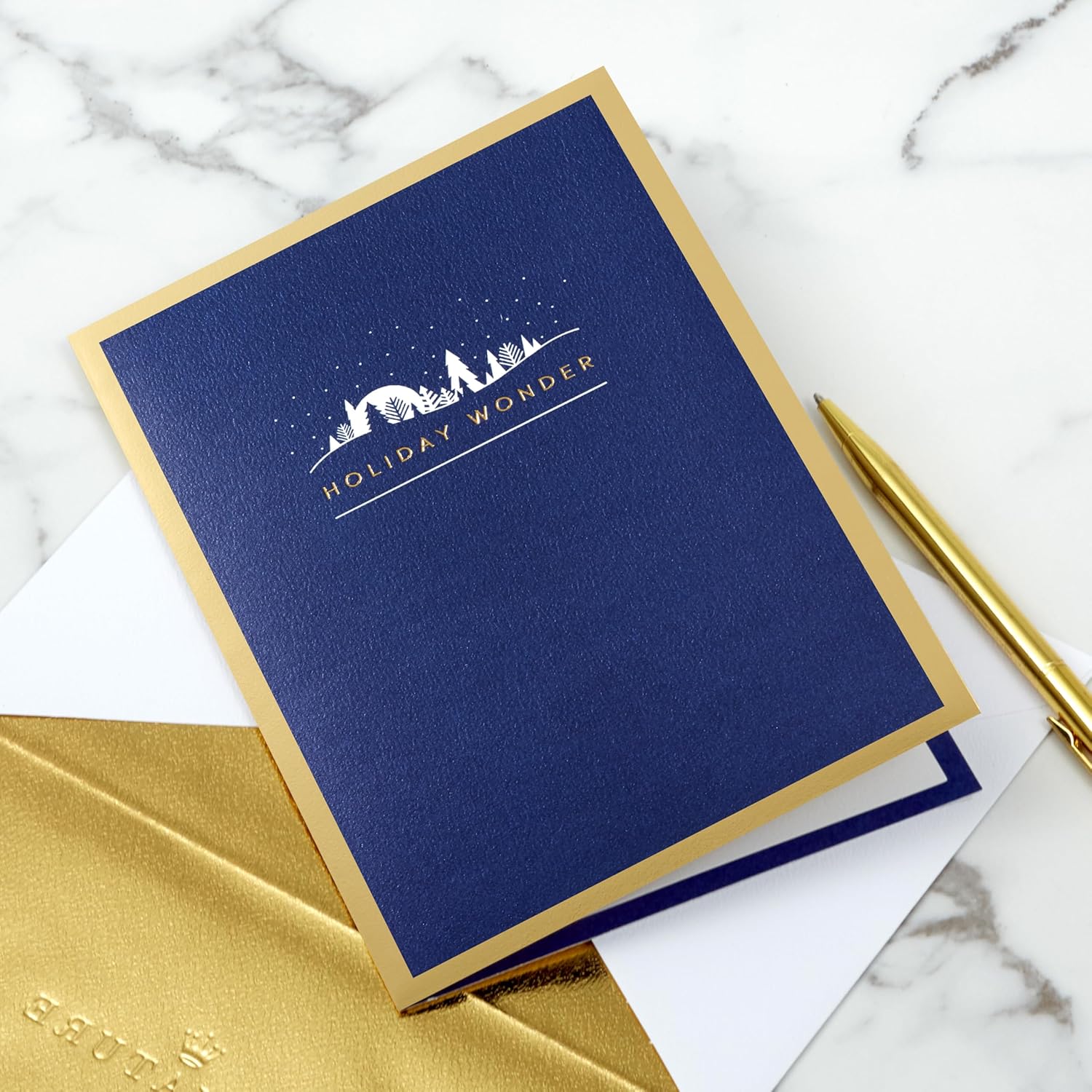 Add a touch of glam and sophistication to their home this Christmas time, and gift them a card they'll love with this stunning 3D and pop up Christmas card with a winter wonderland design from Hallmark. Perfect for the festive season. This Christmas card pops-up to reveal a 3D display of a snowy forest scene in a navy and gold theme, features metallic gold foil details, laser cut details, with the message, 'Holiday wonder' on the front. This card is fully recyclable, and made of material from well-managed, FSC-certified forests and other controlled sources. Bring them lots of festive love and the joy of the season with a heartfelt message in the space provided, and pair your words with our festive message 'Hope this finds you enjoying all the quiet moments and comforts of the season' CARD SIZE: Flat card measures H17.3cm by W11.9cm, constructed card measures H8.5cm by W23.8cm by D17.3cm. This card is accompanied with a Hallmark branded, white envelope with gold foil lining. Within UK 'Large Letter' Postage Size Limits.