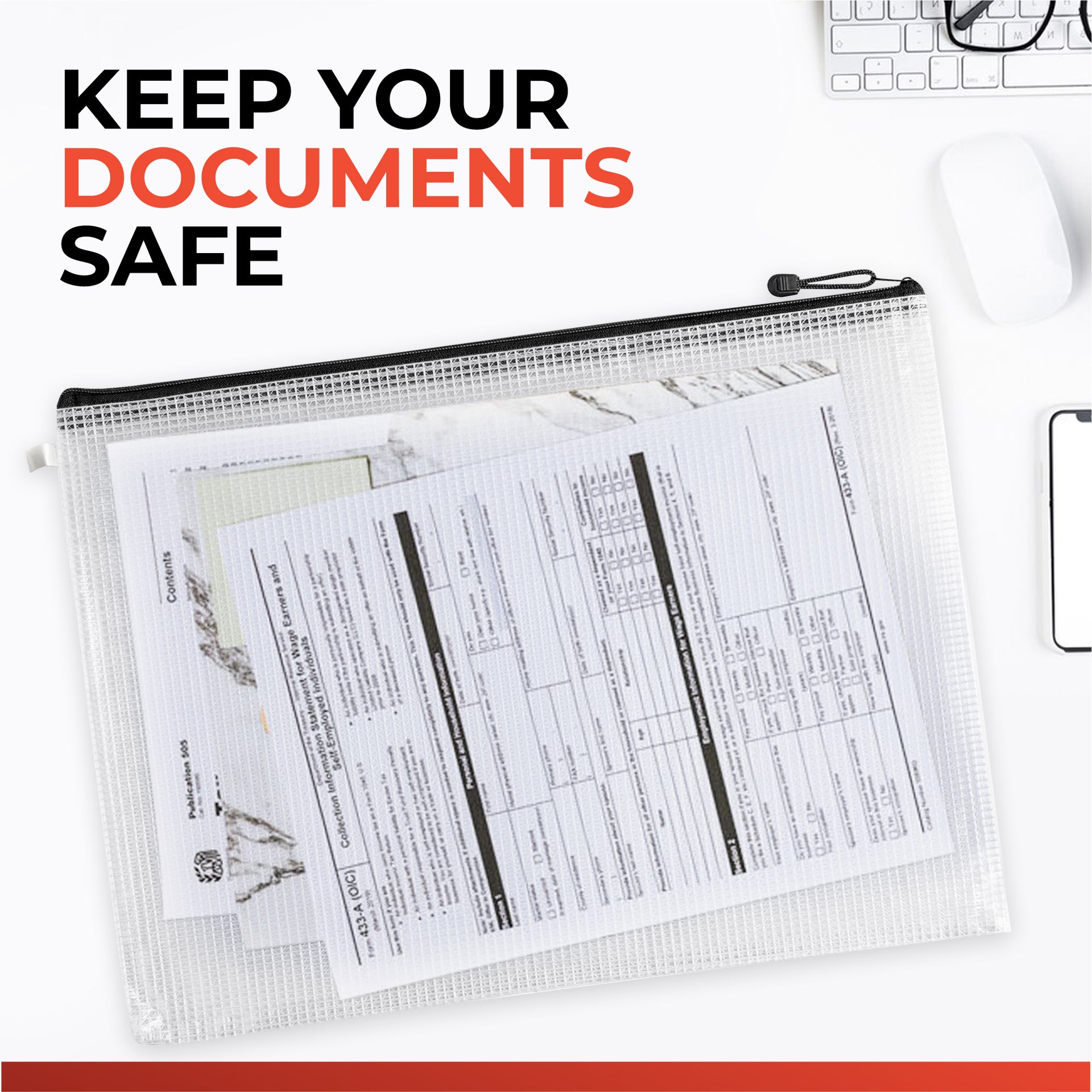 Pack of 9 Assorted Strong Mesh Bags by Janrax. Size: A3, A4, A5. Zip Colours: Black, Blue, Red. Transparent strong mesh reinforced bag with coloured zip. Zip cord for easy opening. 250 Micron. Ideal cases for storing and protecting documents and products. Range of colours from the Janrax range.