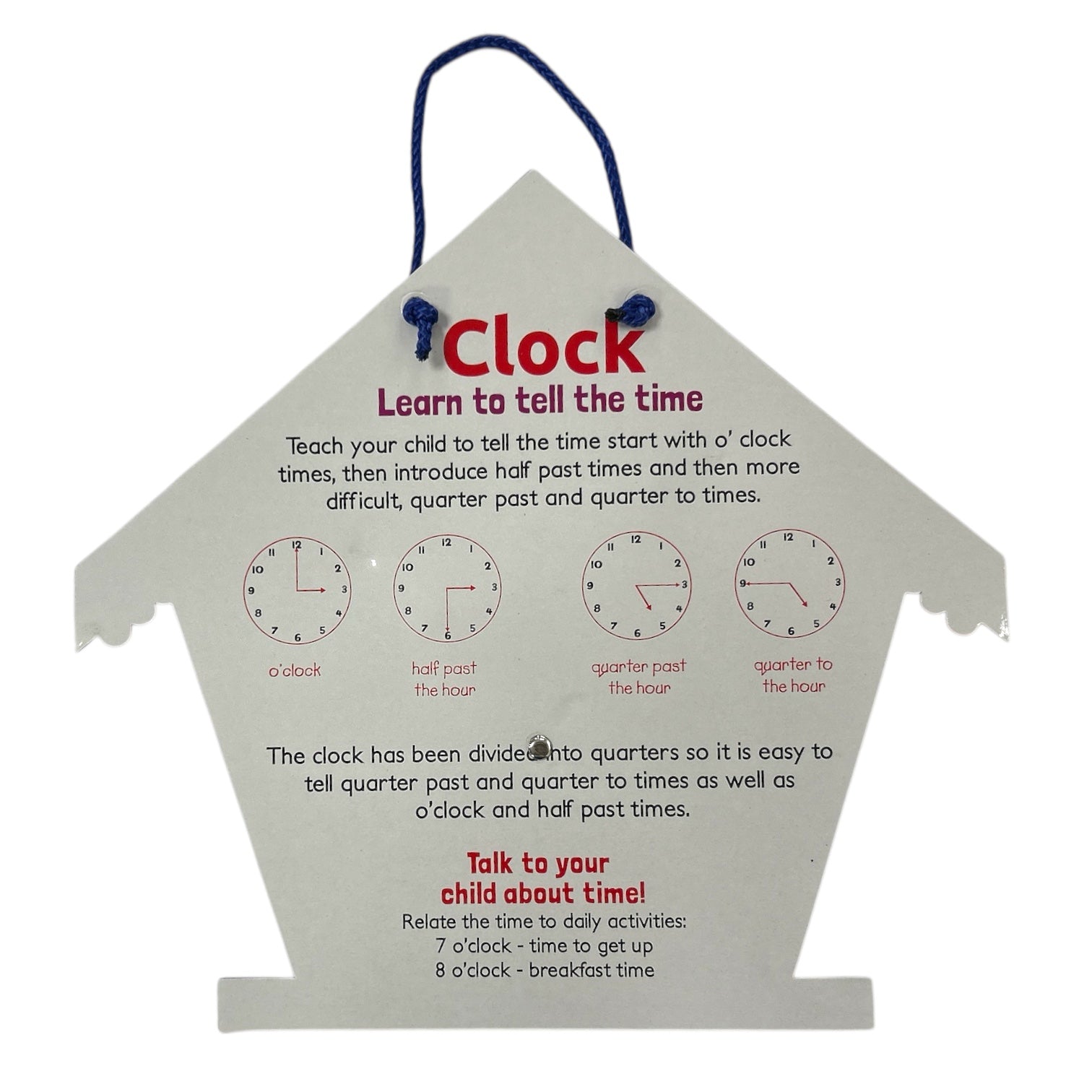 This fun owl clock is a great way to introduce telling the time to your little ones. With a bright design and movable hands. Diameter of clock face is 17.5 cm. Comes with a hanging cord so that it can be easily displayed in a playroom, child's bedroom or classroom. The clock face is marked with 5 minute intervals making it easier for the child to learn. Also shows quarter past, quarter to, half past and o' clock.