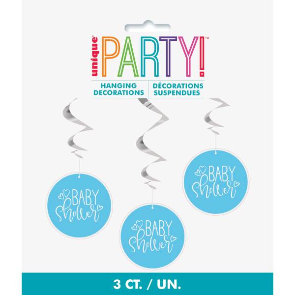 Pack of 3 26" Blue Hearts Baby Shower Hanging Swirl Decorations. These hanging decorations feature blue round cutouts printed with a "Baby Shower" headline. These hanging decorations are perfect for your baby shower party. These hanging decorations are made of durable and recyclable paper. Pop these up on the ceiling and transform your house into a party atmosphere instantly.