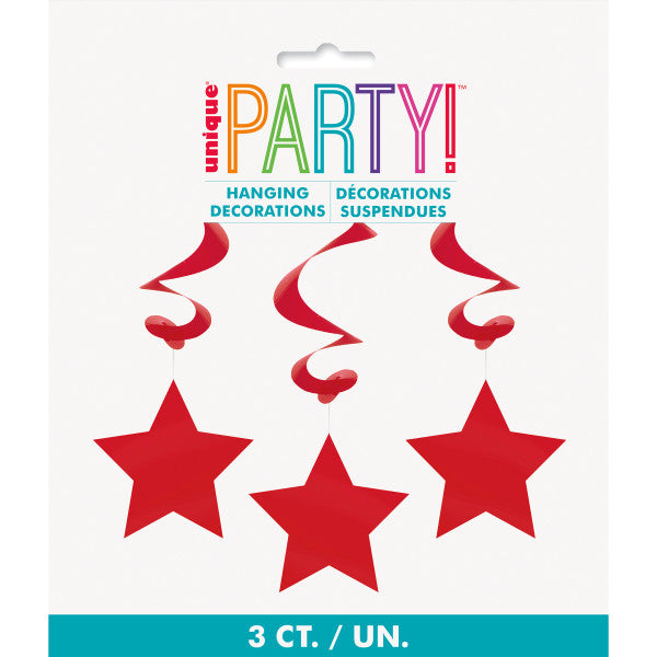 Pack of 3 26" Ruby Red Solid Hanging Swirl Decorations. These beautiful swirls feature red star paper cutouts attached to metallic red foil swirls. This product is an awesome addition to your birthday party decors, bridal showers, and other fun events. This product is made of brightly-colored foil and durable paper materials.These hanging swirls are easy to assemble, install, and can be stored and re-used.