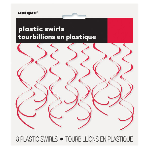 Pack of 8 Ruby Red Solid Hanging Swirl Decorations. Ruby Red Plastic Hanging Swirl Decoration. 8 hanging swirls - 26 inches. These hanging decors feature ruby red plastic swirls that measure 26 inches long. This product is great for your party decors on birthdays, bridal showers, and other fun events. This product is made of brightly-coloured and durable plastic material. These hanging swirls are easy to assemble, install, and can be stored and re-used.