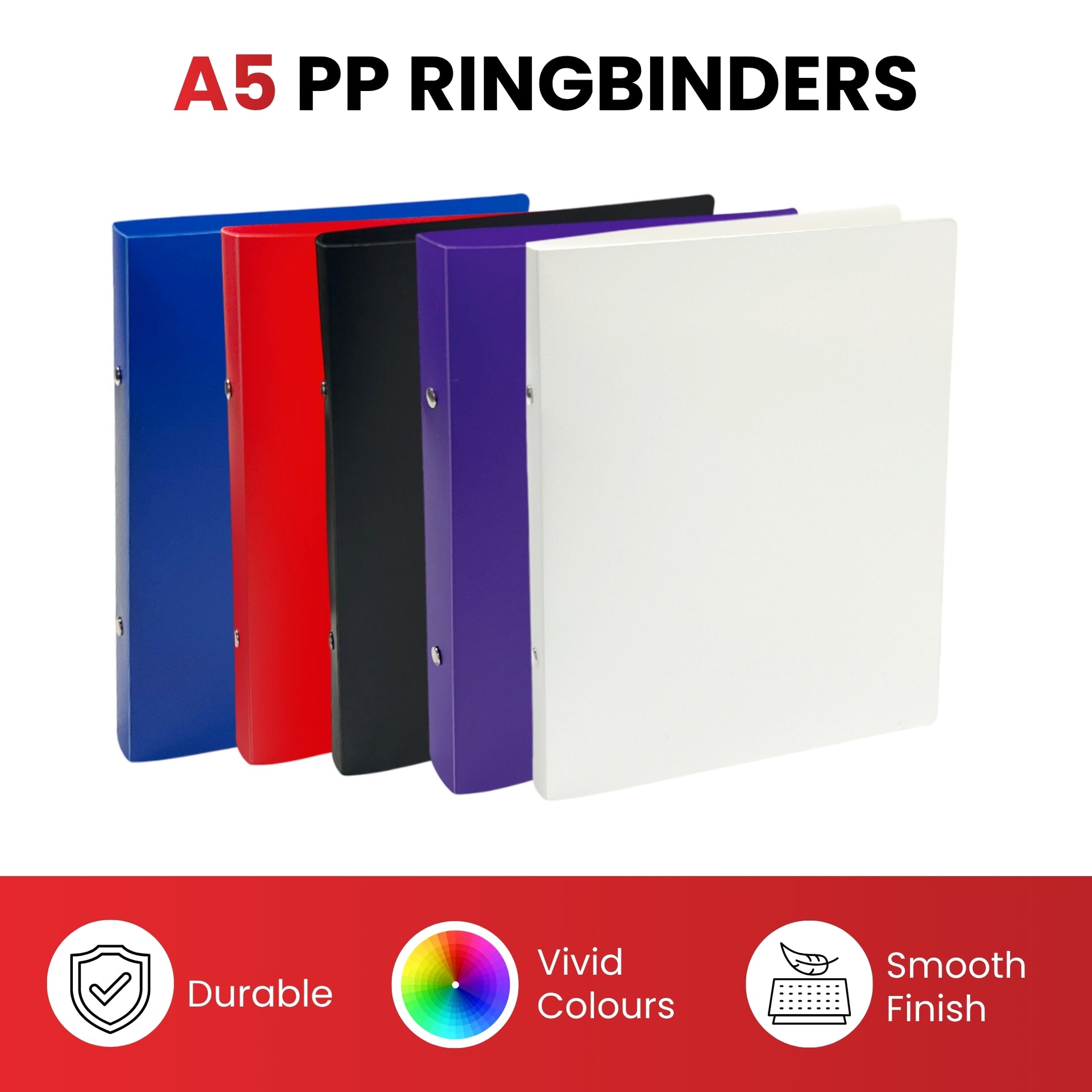 A5 Black Ringbinder. 2 O-Rings for Secure Storage and Easy View. 700 micron cover. Spine 25mm. More colours available in the Janrax range.