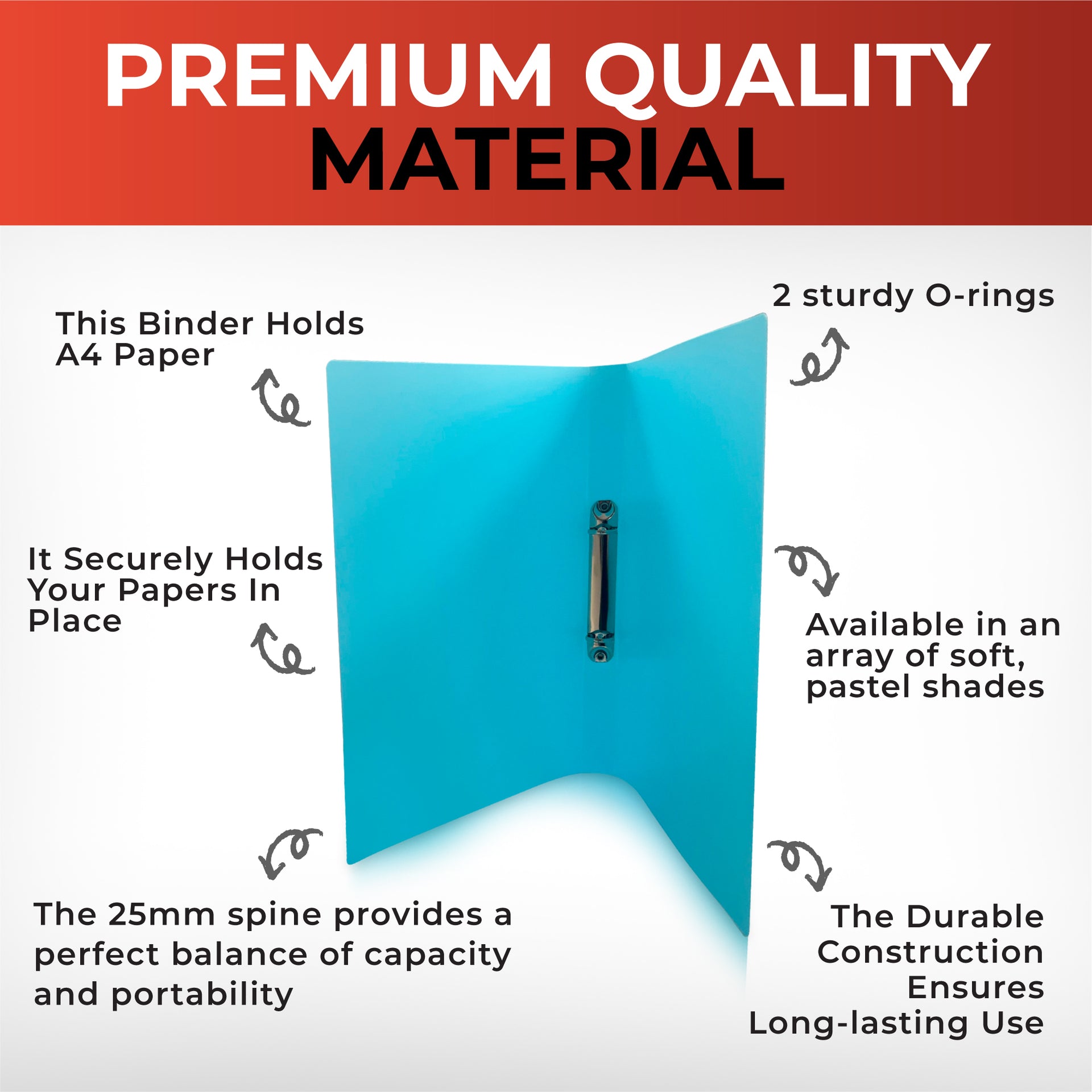 Pastel Green A4 Ring Binder. Introducing the Pastel Colour A4 Ring Binder, a stylish and functional addition to your organisational tools. This binder holds A4 paper, ensuring ample space for all your documents, notes, and projects. Equipped with 2 sturdy O-rings, it securely holds your papers in place. The 25mm spine provides a perfect balance of capacity and portability, allowing you to store multiple sheets without the bulk. Available in an array of soft, pastel shades, it adds a touch of elegance and calm to your workspace. The durable construction ensures long-lasting use, keeping your papers secure and neatly arranged. Ideal for students, professionals, and anyone who values both aesthetics and practicality in their office supplies.
