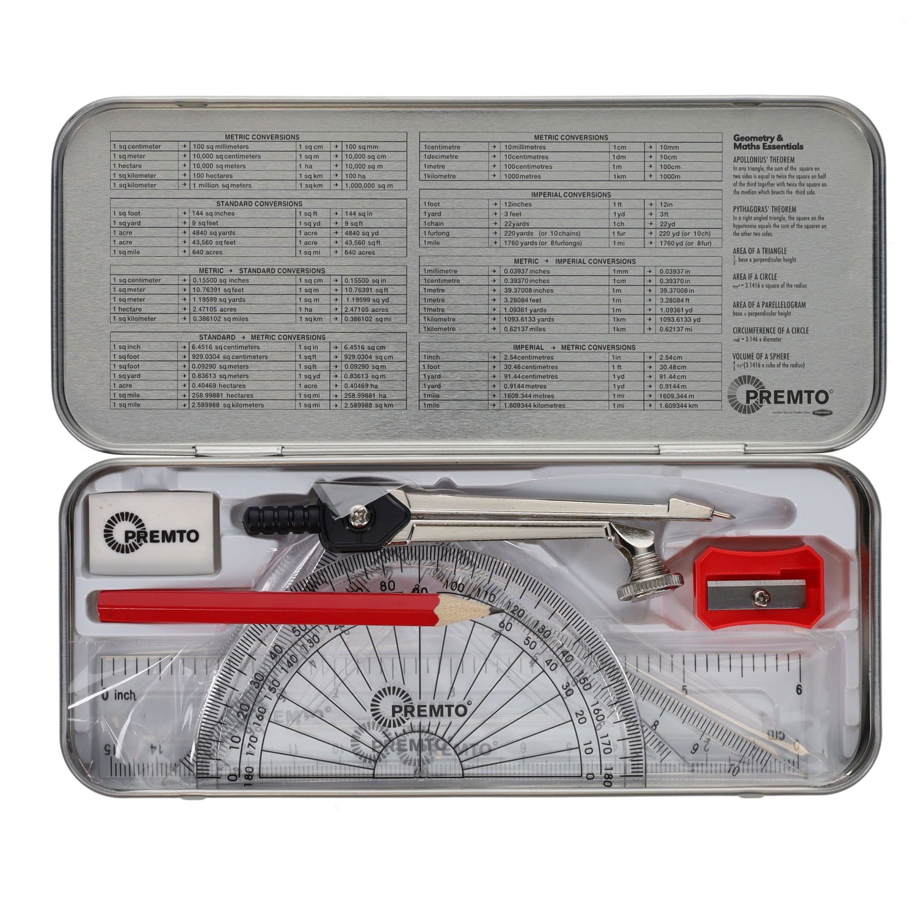 9 piece Ketchup Red Maths Set By Premto. Ultimate Geometry and Maths Essentials. Set includes: Ruler, Pencil, Sharpener, 45 degree set square, 60 degree set square, Eraser, Compass, 180 degree protractor, Timetable & measurement sheet.