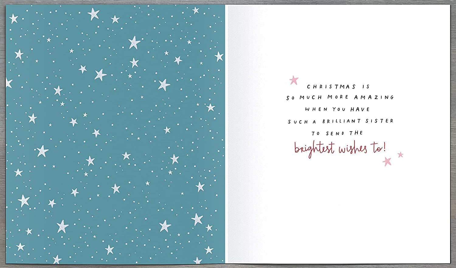 You are viewing: A greeting card. Occasion: Christmas. Message: Christmas is so much more amazing when you have such a brilliant sister to send the brightest wishes to! Details: A wonderful decorative foiled and beautifully embellished Christmas greeting card with a quality finish and a lovely verse inside, it comes complete with a quality envelope. Size: Standard 15.5cm x 18.5cm 6" x 7"