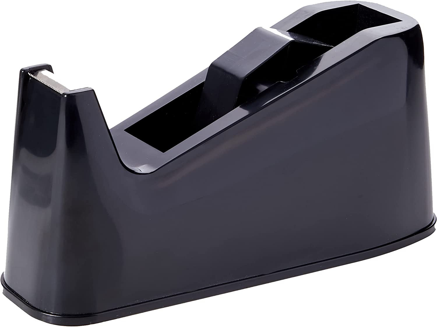 25mm Wide Large Black Tape Dispenser. Providing quick and easy access to tape, this dispenser is suitable for use with rolls of tape measuring 33m or 66m long and 25mm wide. Ideal for the home or office, this black tape dispenser has a durable plastic construction and a non-slip base for desktop use.