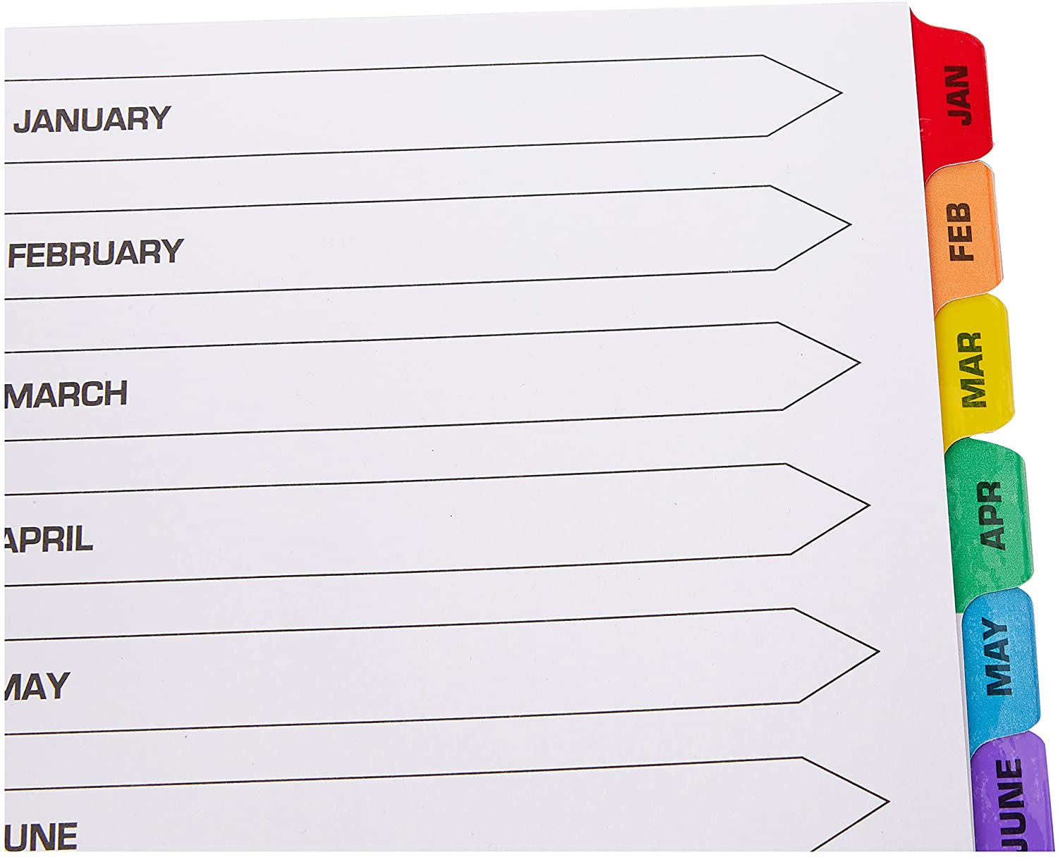 A4 Pre-Printed Tabs Multi Punched January to December Reinforced Multi-Colour Index. This Q-Connect January-December index divider provides a clear and simple filing solution for your everyday office needs. The front index sheet provides space for labelling to make referencing your notes quick and easy. Made from plain white card with multi-coloured Mylar tabs for extra reinforcement. This 12 part index comes with pre-printed tabs (January-December) and is multi-punched to fit standard lever arch files or ring binders.