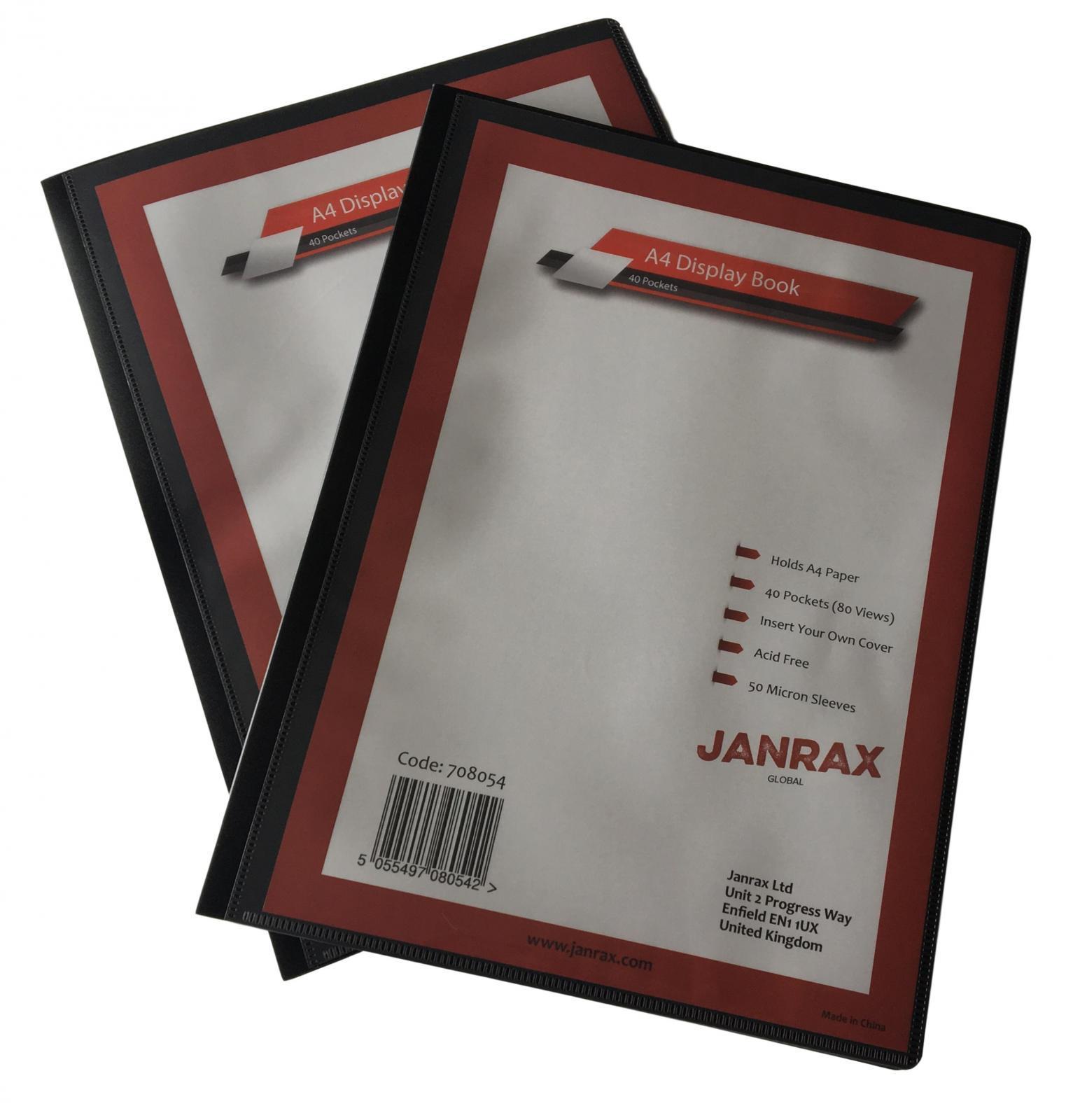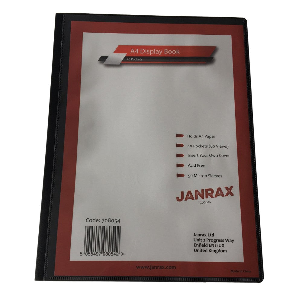 A4 40 Pocket Presentation Display Book by Janrax. 40 copysafe pockets (80 sides to view), removeable front sheet for personalised cover. 150 micron clear sheet + 600 micron cover/50 mic pockets. Black for professional presentations. Ideal size for menus, hymn sheets etc.