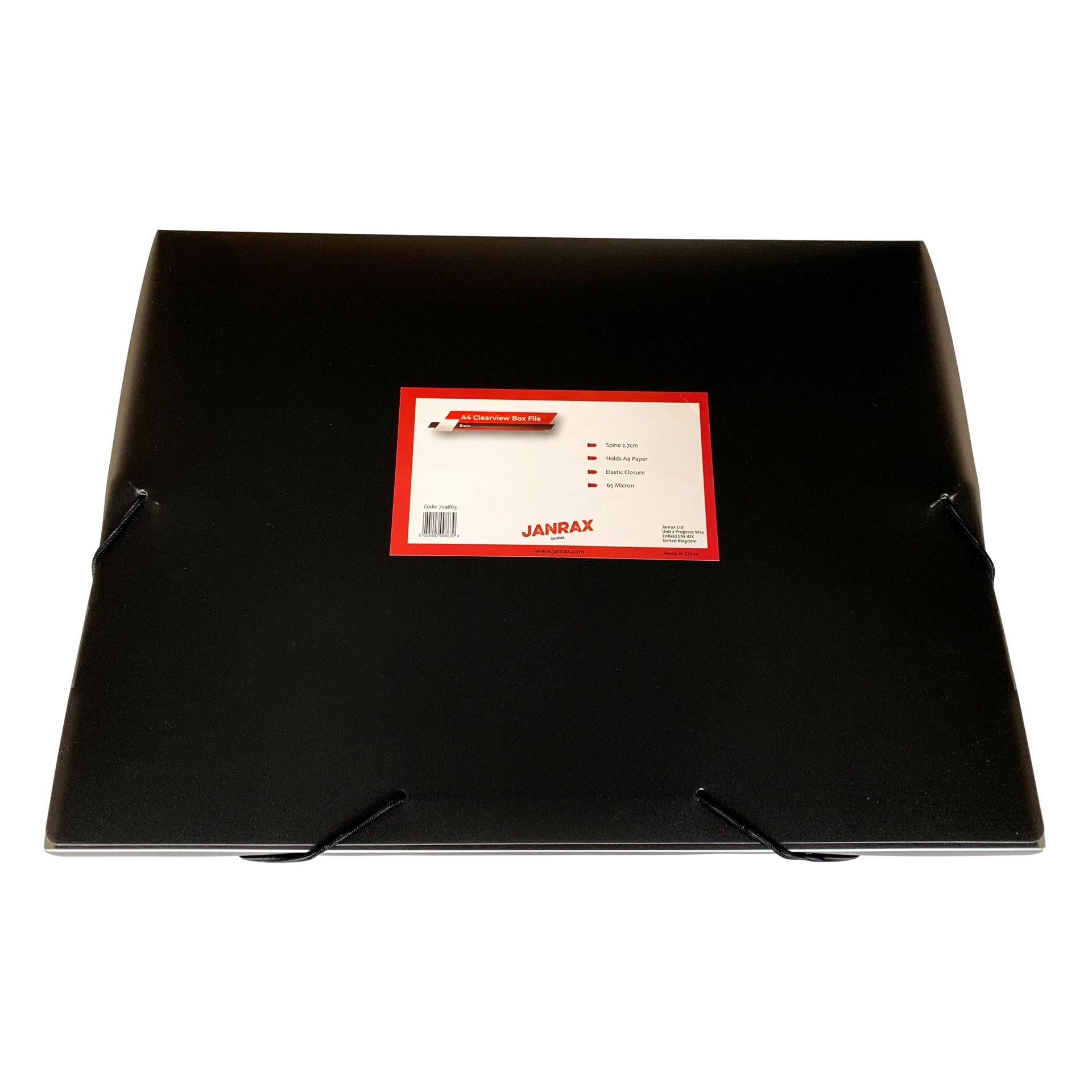 60 x A4 Clearview Black Box Files with Elastic Closure. Spine 2.7cm. Holds A4 Paper. Elastic closure to keep documents secure. 65 Micron. Will be supplied flat packed.