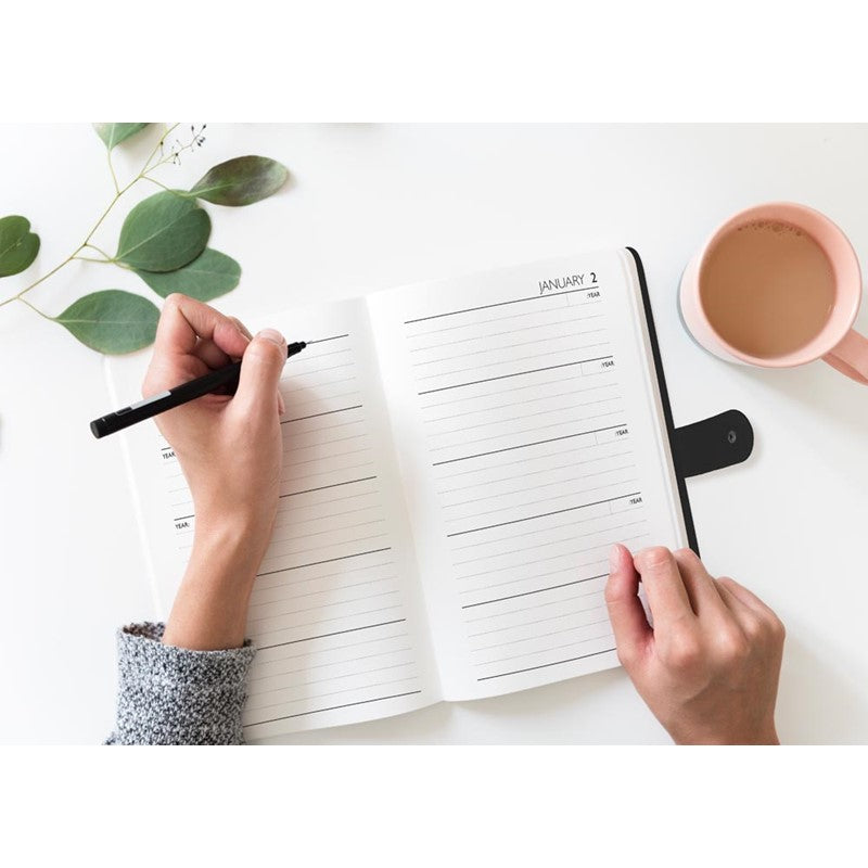 Single A5 Undated 5 Year Day A Page Index Fabric Diary. Two assorted colours: Pink and Black. One random colour will be supplied.
