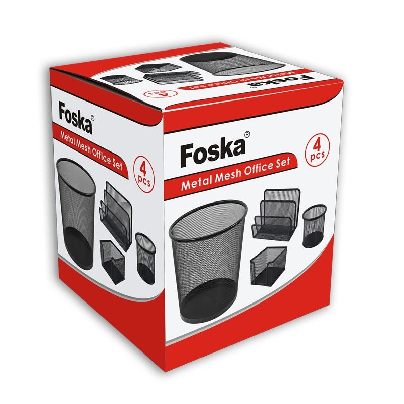 4 Piece Wire Mesh Office Desk Organiser Set. Colour: Black. Includes pen pot, waste basket bin, letter holder and memo note block holder. The 4 Piece Wire Mesh Office Desk Organiser Set in black is a sleek and functional collection designed to enhance the organization and aesthetics of any workspace. This set includes four essential items: a pen pot for storing writing instruments, a waste basket bin for tidy disposal, a letter holder to keep mail and documents neatly arranged, and a memo note block holder for easy access to sticky notes or small notepads. Each piece is crafted from durable wire mesh, combining robust construction with a contemporary look that fits seamlessly into both modern and traditional office environments. The unified black colour scheme adds a touch of sophistication, ensuring that these organisers not only serve practical purposes but also contribute to the visual appeal of your desk setup. By providing a designated place for common office items, this set helps reduce clutter and promotes a more efficient, focused work area. Ideal for professionals, home offices, or students, the 4 Piece Wire Mesh Office Desk Organiser Set is a simple yet effective solution for keeping your workspace orderly and stylish. Whether used together for a cohesive look or separately to address specific organisational needs, this set is an invaluable addition to any desk.