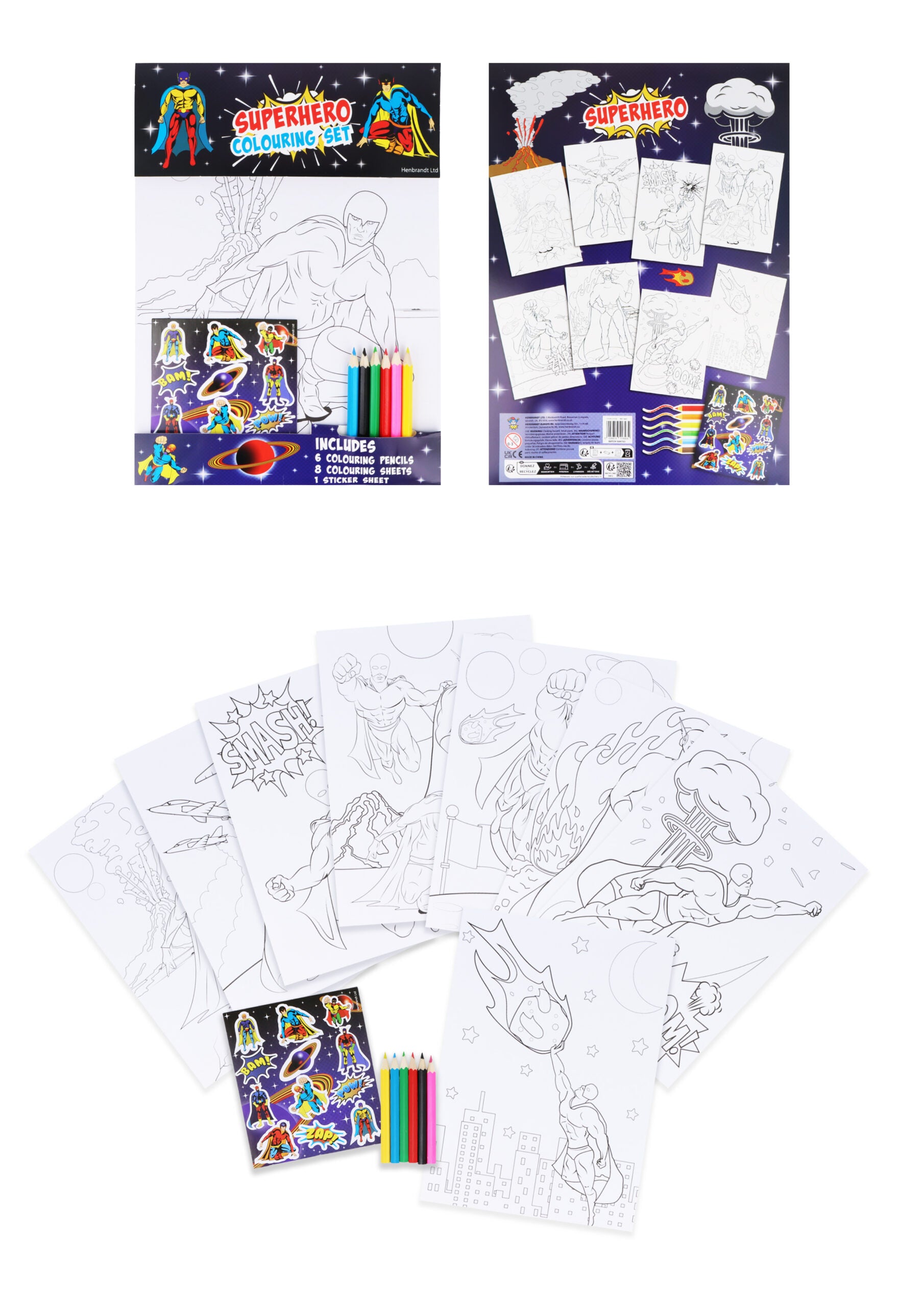 This super colouring set includes 8 Superhero colouring sheets, 6 mini colouring pencils, and 1 sticker sheet. They are perfect party activities and classroom fun. Size: A4 / 21cm x 30cm.