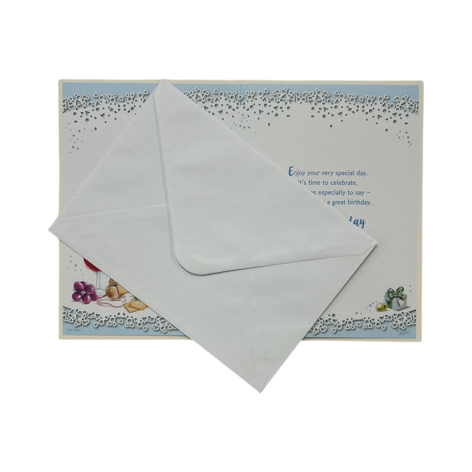 Celebrate your Uncle’s special day with this fun and playful birthday card. The front features a cute mouse happily nibbling on cheese, sitting next to a wine glass and bunch of grapes, creating a lighthearted and charming scene. The card is beautifully embossed with intricate details and accented with shimmering foil, adding an extra touch of elegance. Inside, you'll find warm Birthday Wishes that convey your love and appreciation. This card is the perfect way to make your Uncle's birthday celebration even more memorable. The card comes with a coordinating envelope. Card Size: Approx. 19.5 x 14 cm.